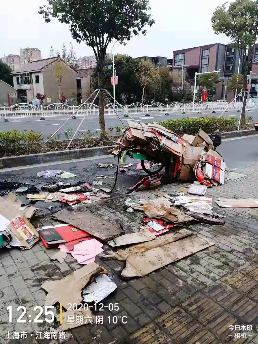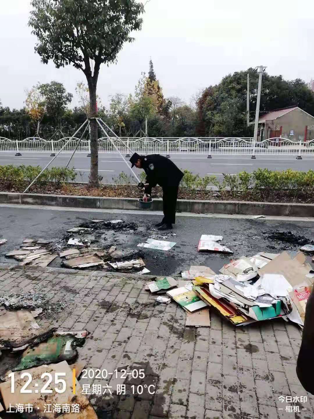经过10多分钟的努力,火被浇灭。随后,两人又帮助老人将废品纸板整理好装上车,并从城运中心借扫把把路面残渣清扫干净。