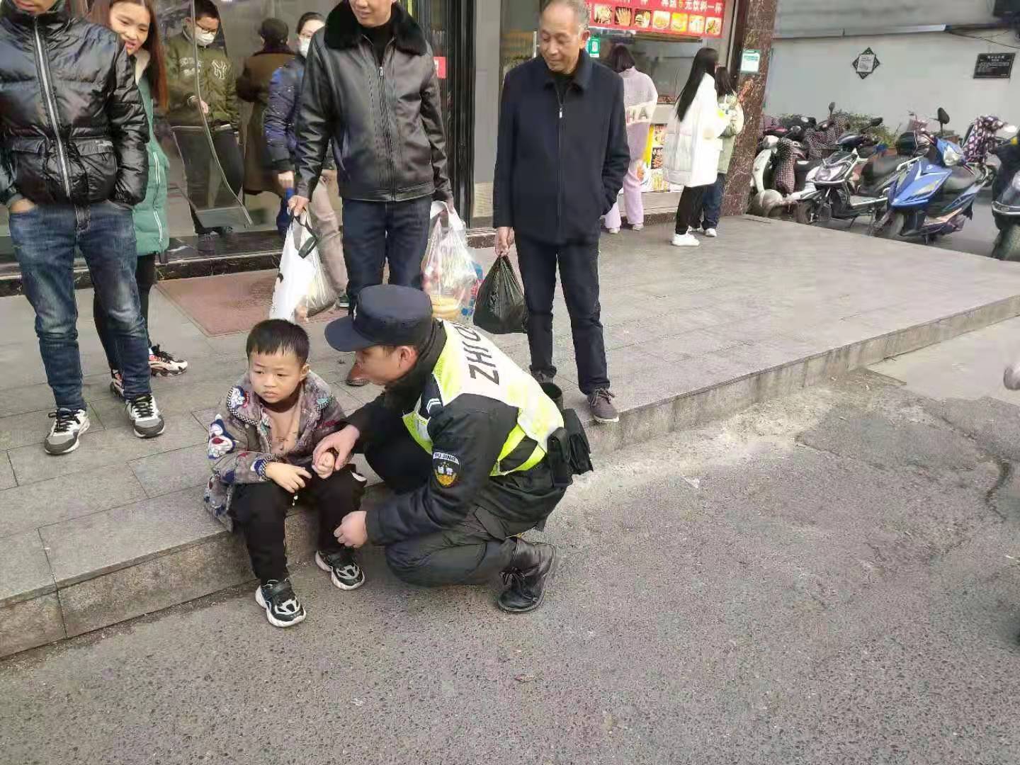 当天15:45,李冠峰、李响在东湖北路永旺菜市场值勤时,发现一个男孩坐在路边,神情紧张,茫然无措,周围也没有大人看管。