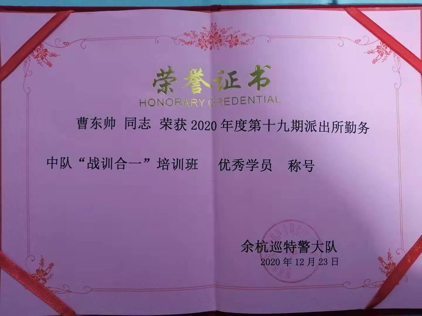 经过半个月的封闭式训练,曹东帅凭借过硬的素质,优异的表现,荣获“优秀学员”称号,不仅为仓前派出所赢得了荣誉,也为宗保公司争了光、添了彩。