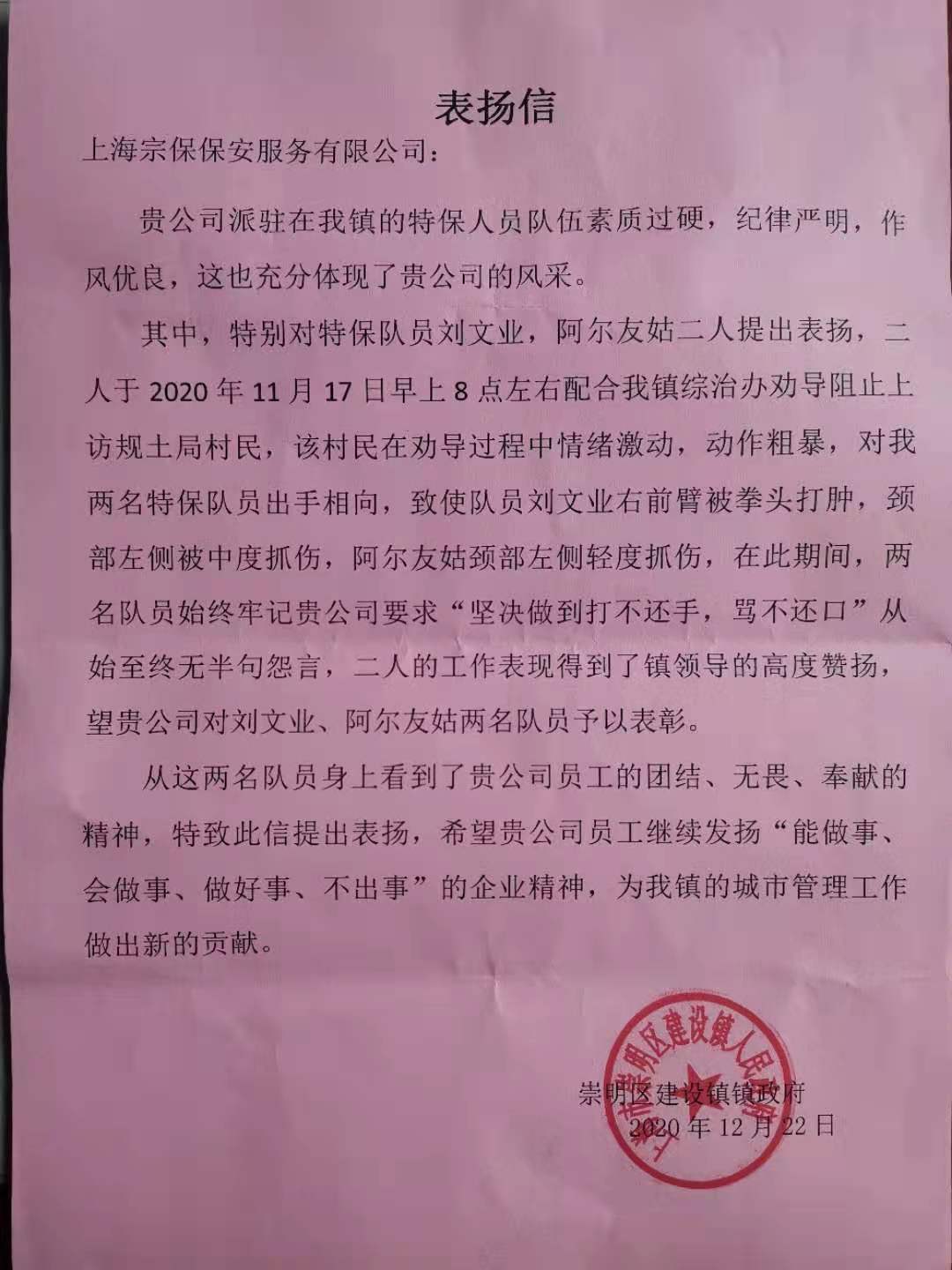 12月22日,宗保公司驻崇明区建设镇城管辅助项目收到建设镇政府送来的一封表扬信,信中对刘文业、阿尔友姑的优秀表现提出特别表扬。