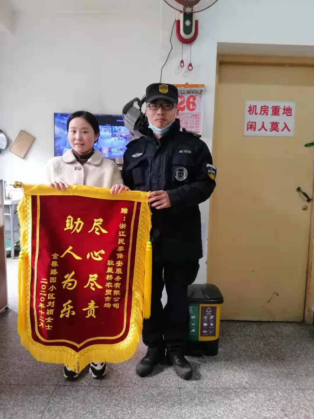 12月21日,星桥农贸市场项目队员杨斌收到市民刘颖女士送来的一面绣有“尽心尽责 助人为乐”的锦旗,感谢杨斌为她找到了手机。