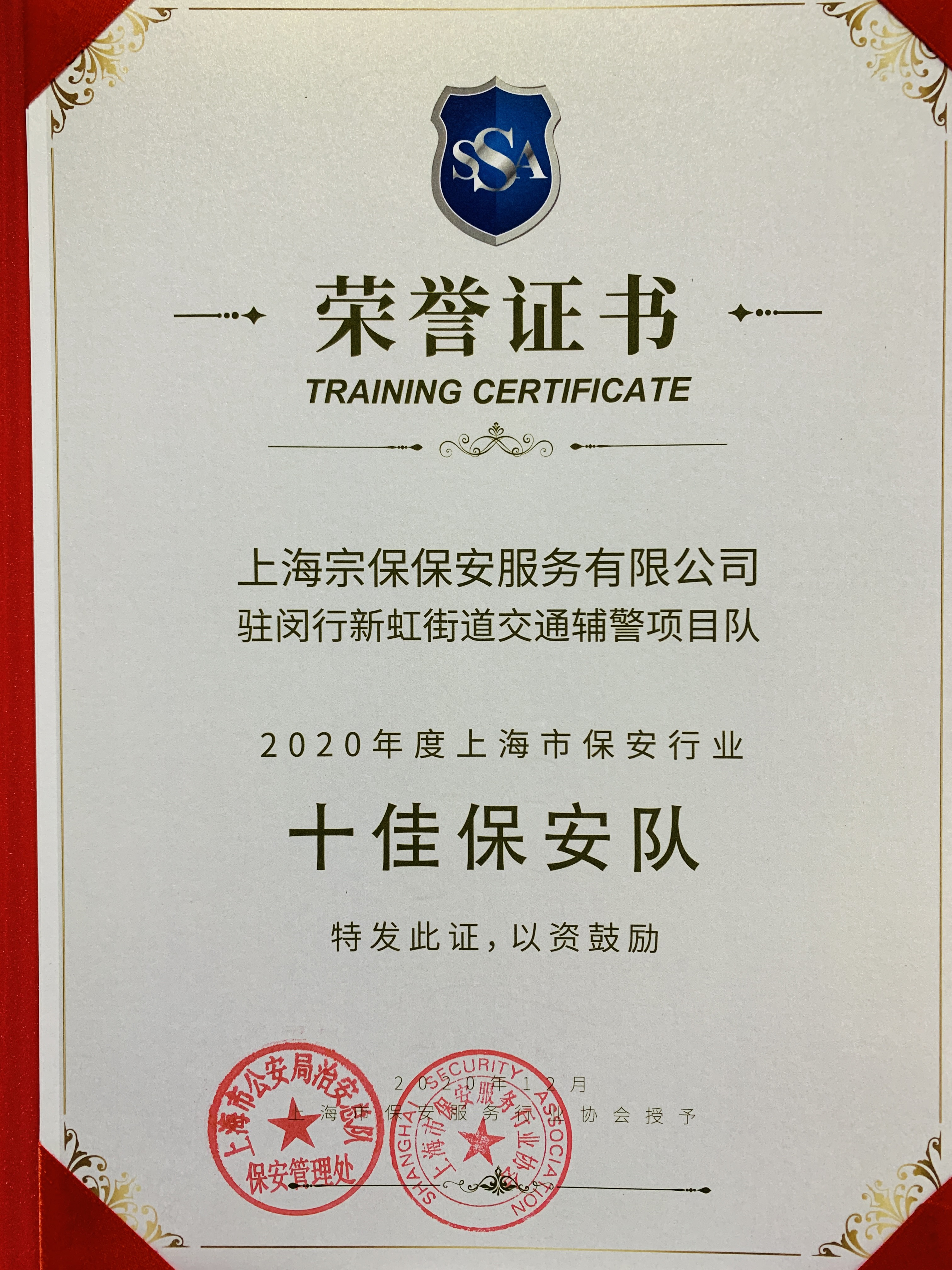 公司驻闵行新虹街道交管辅警项目队被评为“2020年度上海市保安行业十佳保安队”。