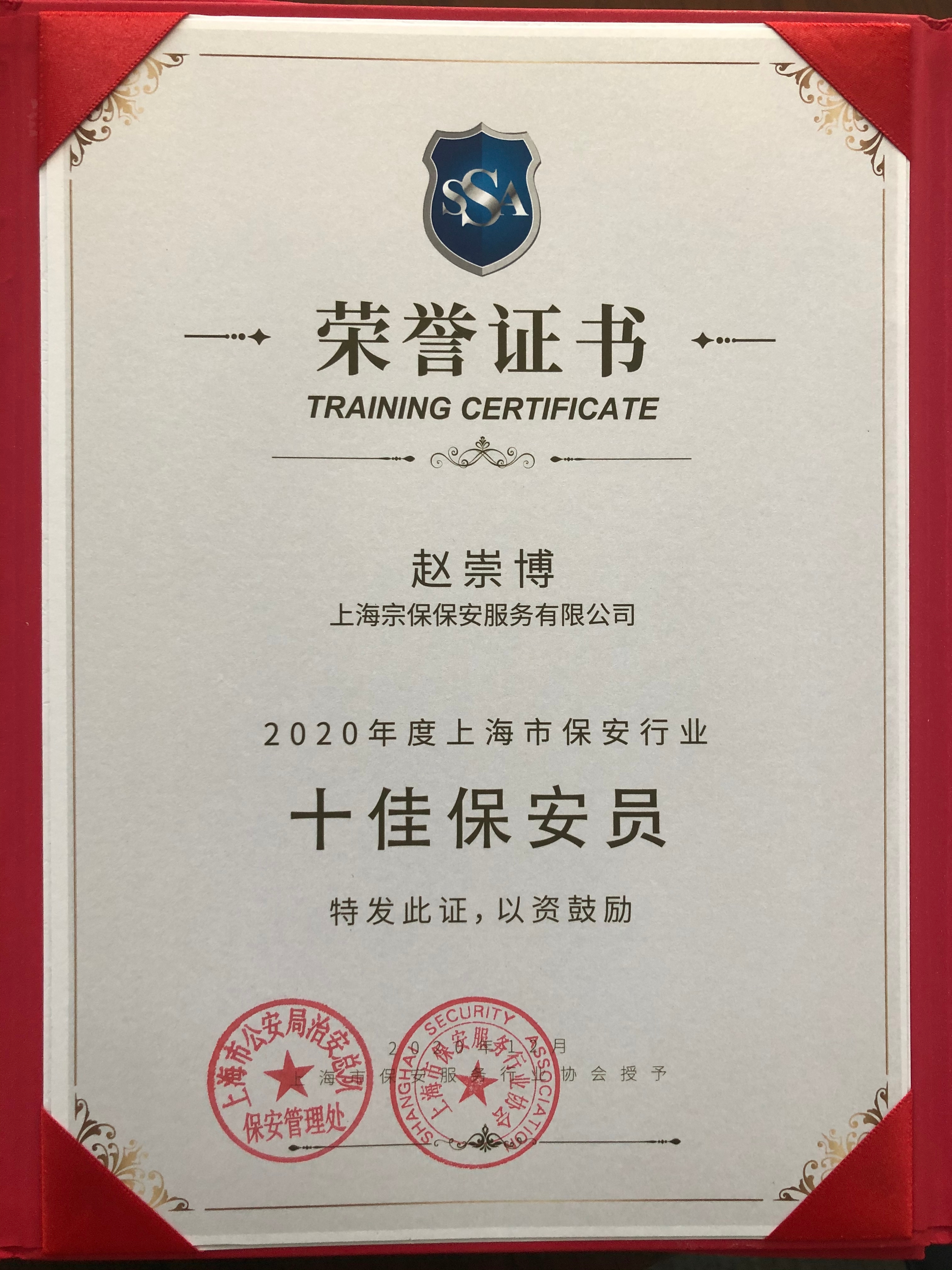 公司员工赵崇博被评为“2020年度上海市十佳保安员”。