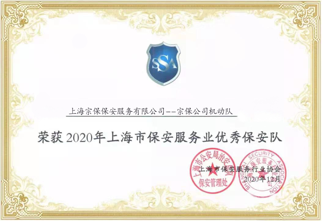 公司机动队被评为“2020年度上海市保安行业优秀保安队”。
