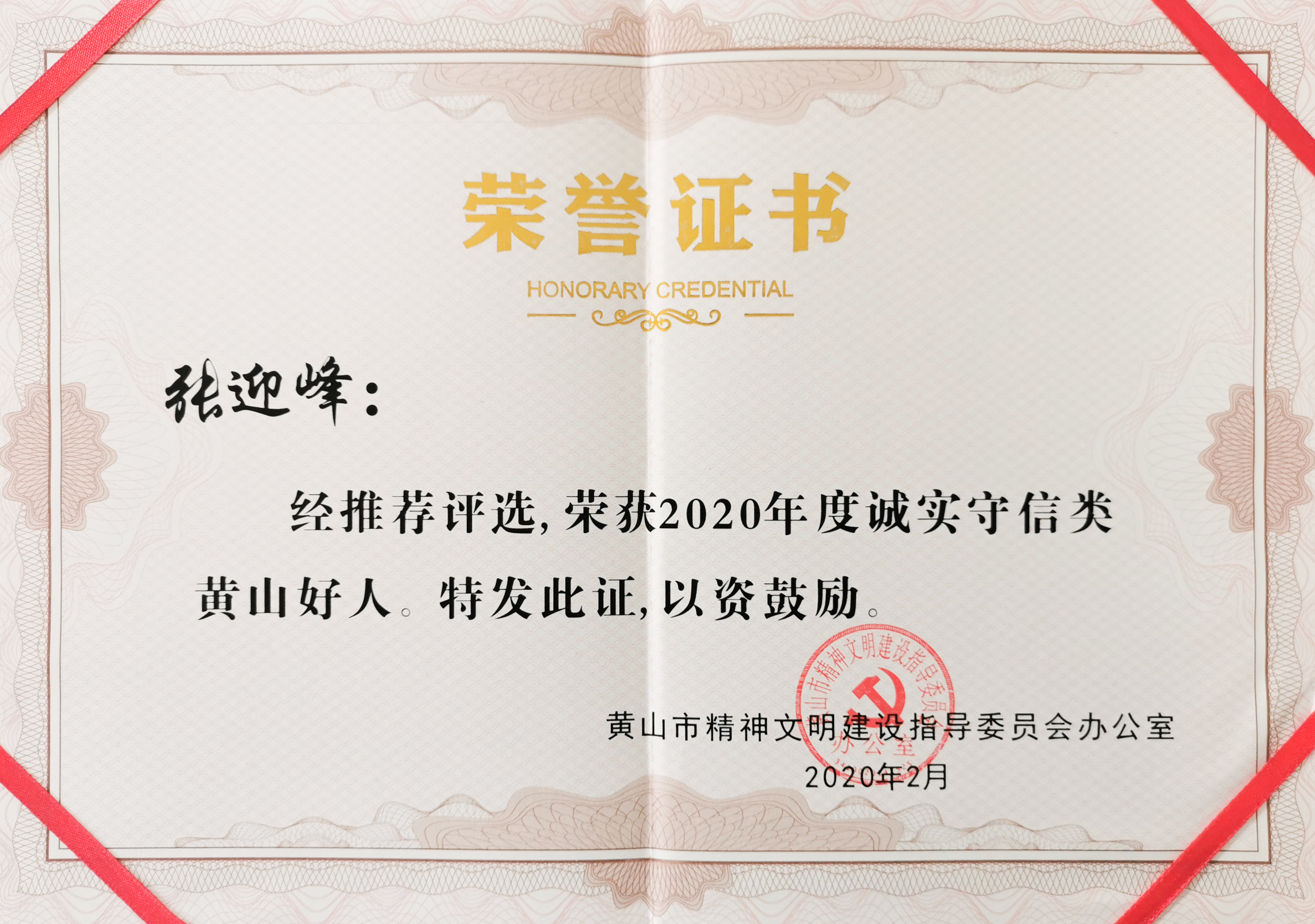 近日,宗保公司黄山分公司驻徽州区市容项目队员张迎峰被评选为2020年诚实守信类黄山好人。