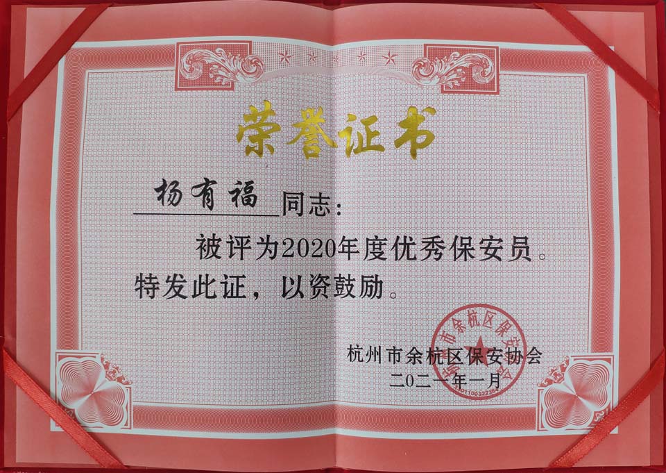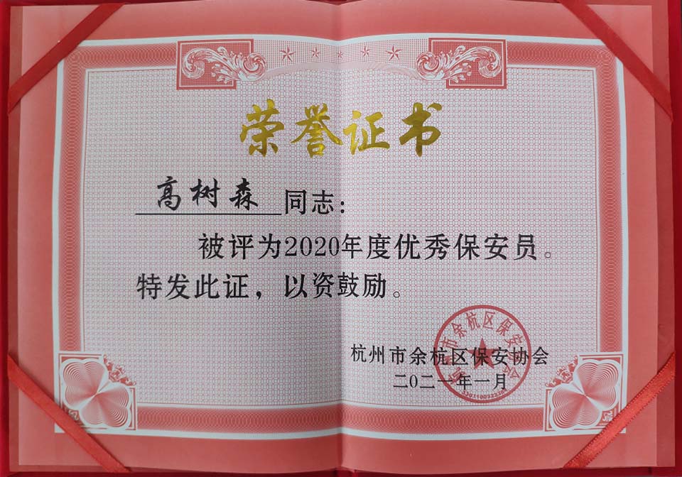 浙江民泰公司被评为2020年度优秀保安服务公司,保安员杨有福、高树森被评为2020年度优秀保安员,布超杰被评为余杭区治保先进个人。