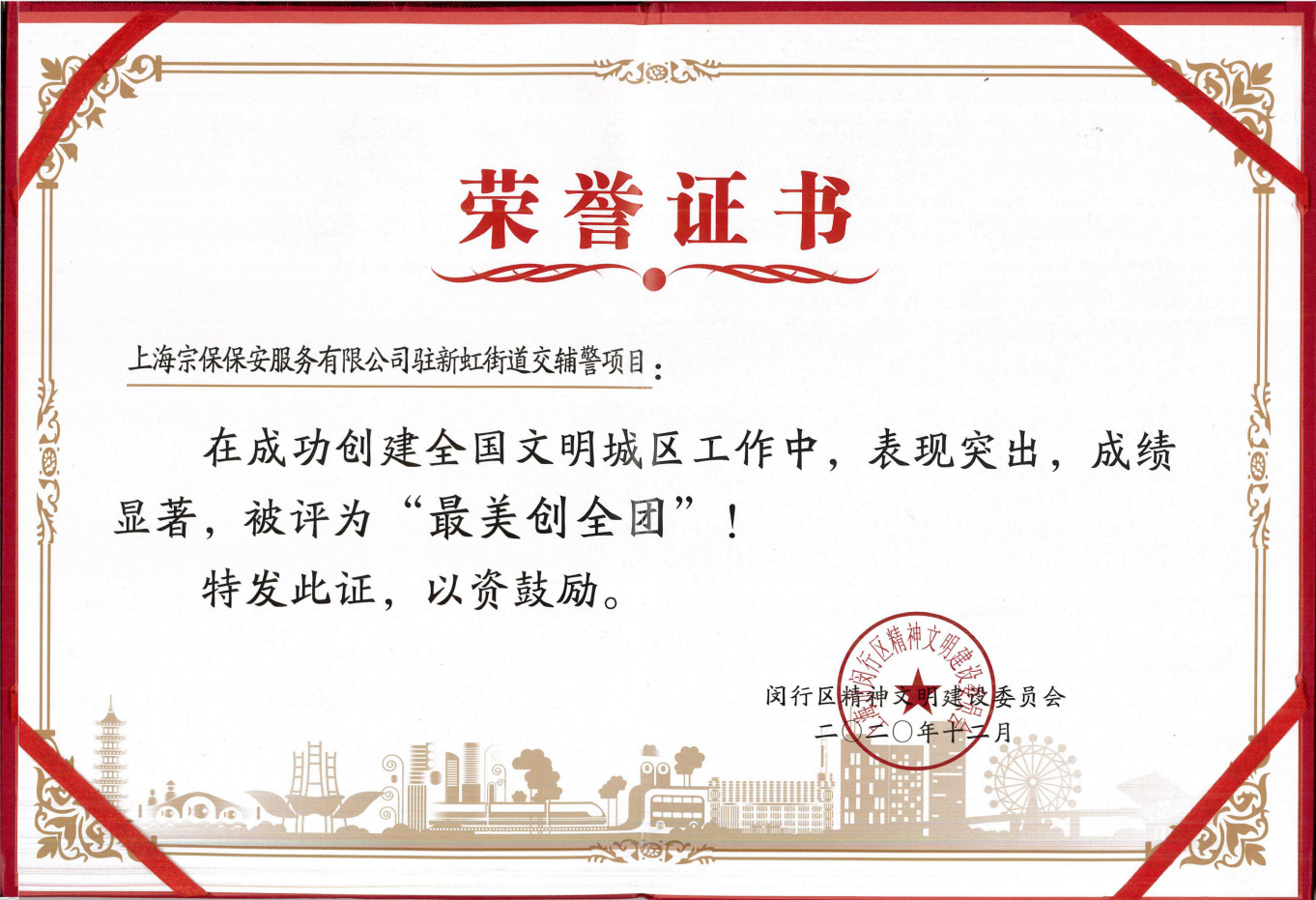 1月7日,闵行区召开巩固提升全国文明城区建设工作大会,宗保公司驻新虹街道交管辅警项目表现突出,被评为“最美创全团”。