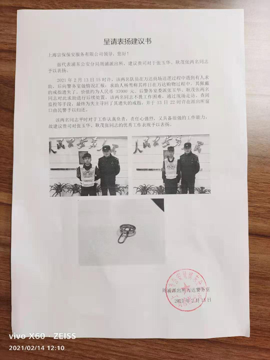 2月13日,公司收到周浦派出所万达警务室送来的表扬建议书,建议表扬公司驻周浦辅警项目队员张玉华、耿茂张。