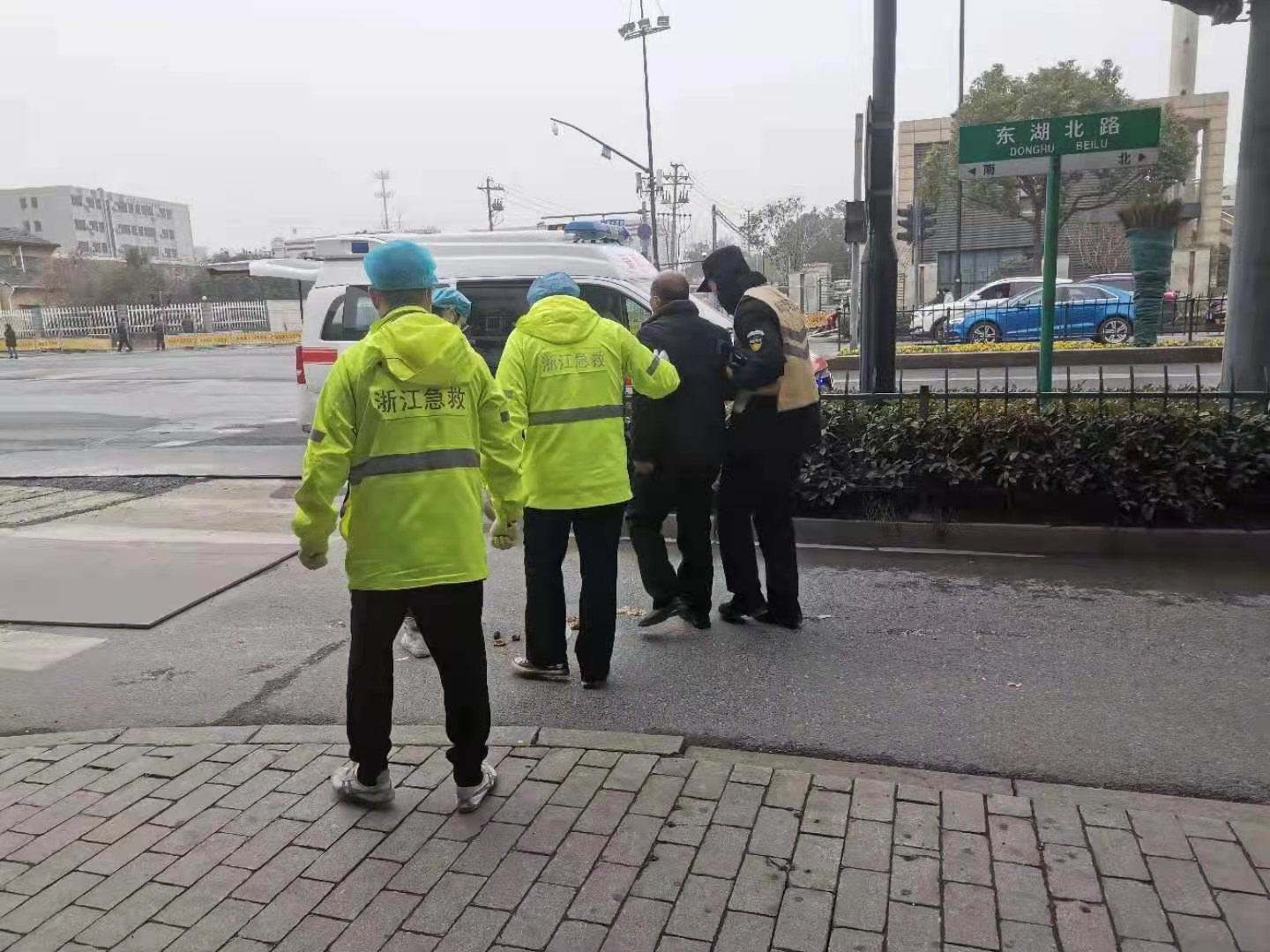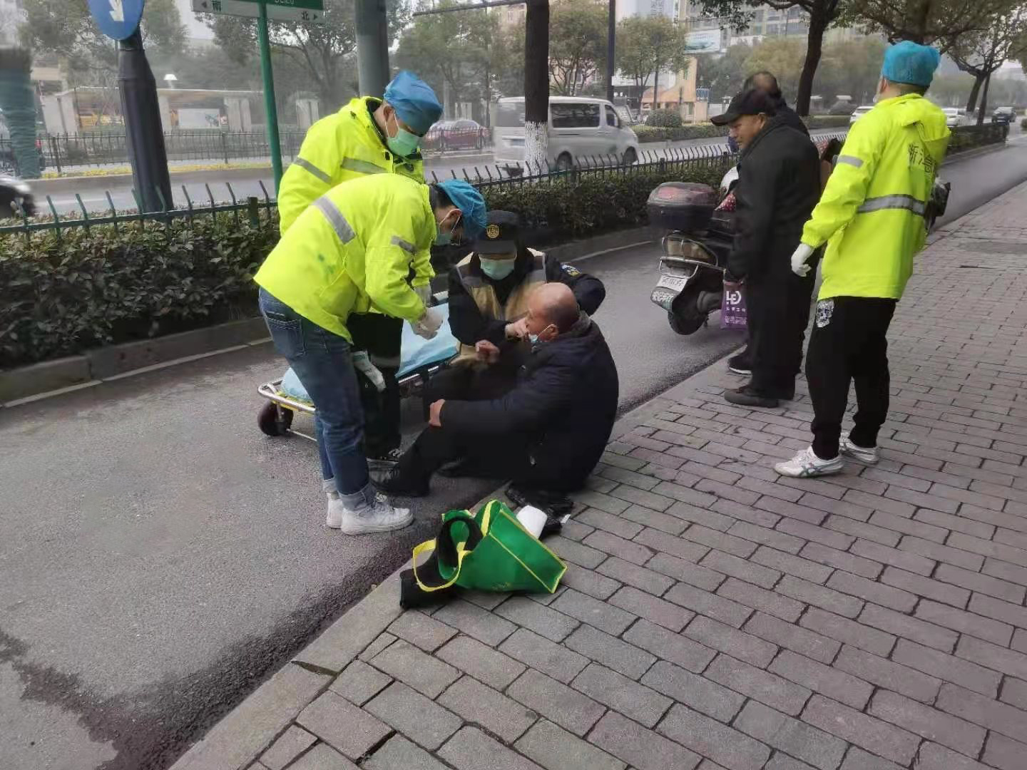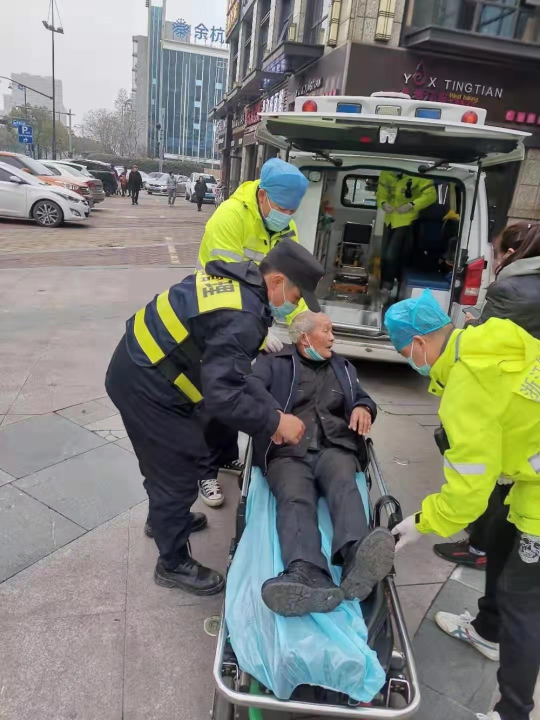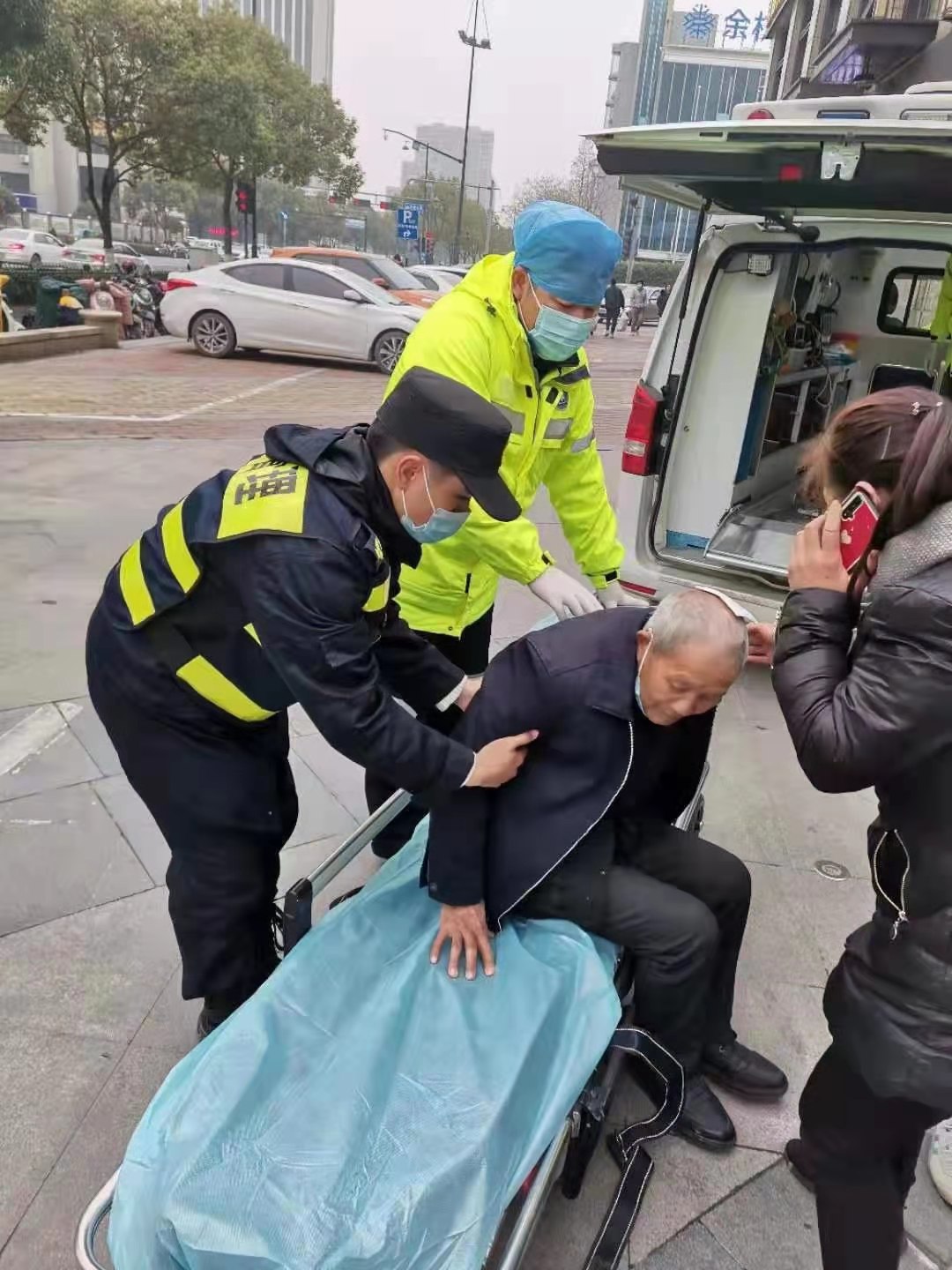 很快,120救护车赶到现场。沈明锐、鲁福龙协助医护人员和老人家属将老人抬上救护车。随后,两人回到岗位继续巡逻。
