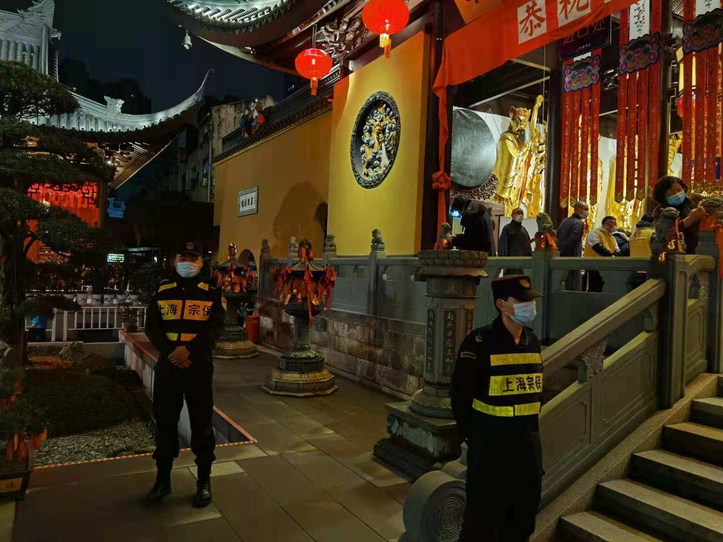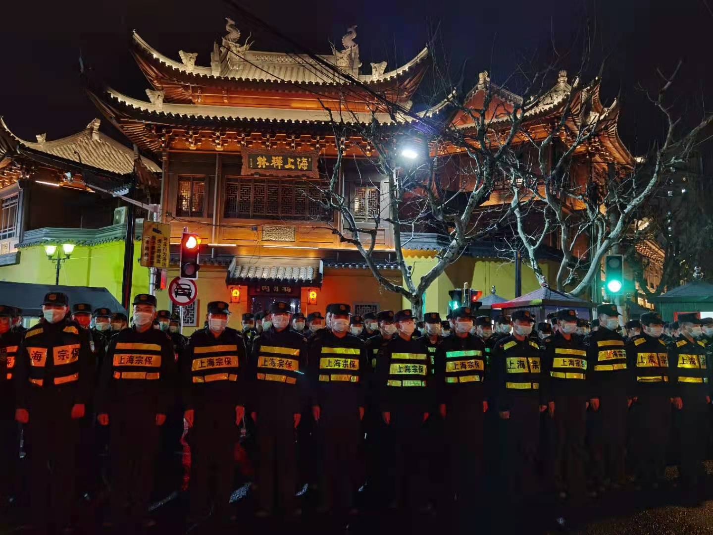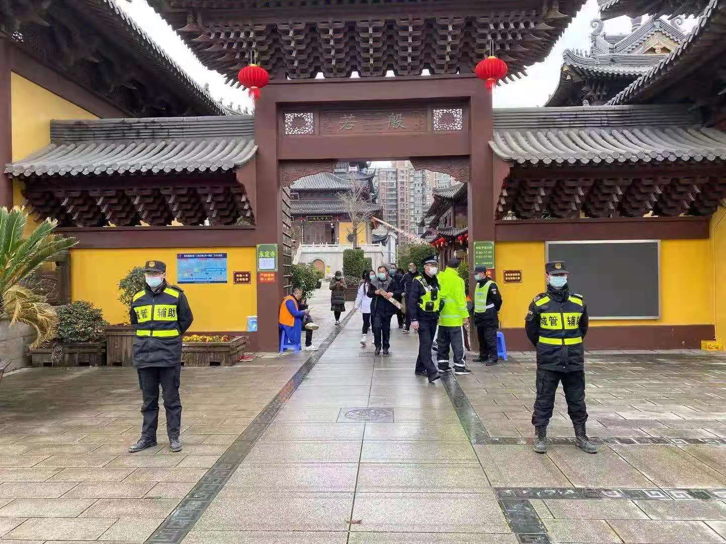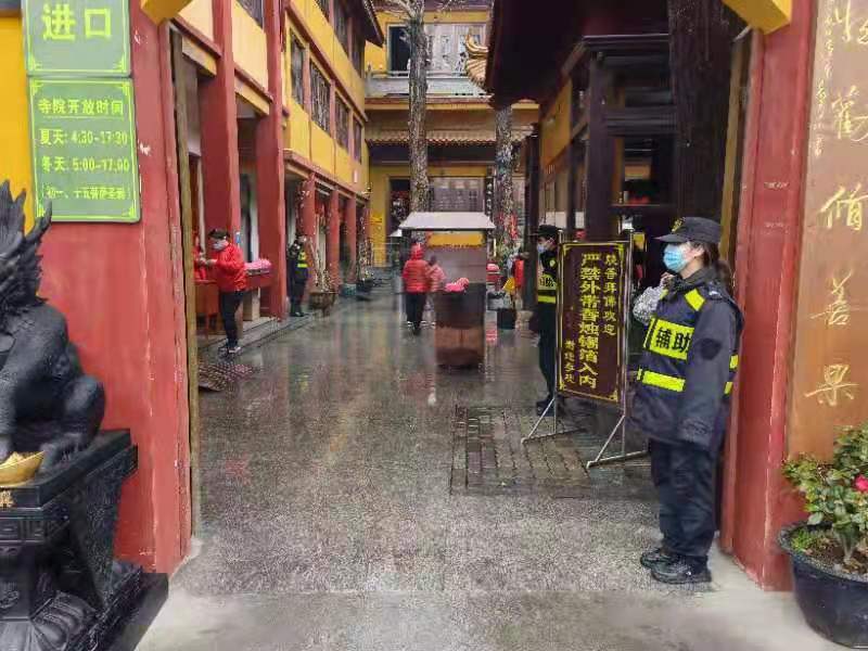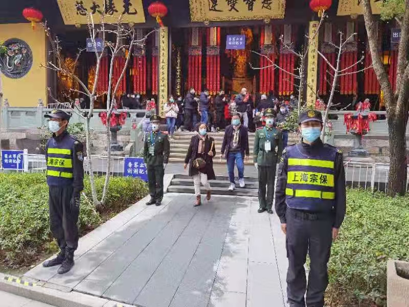 春节期间,众多市民群众到名寺古刹烧香祈福。为确保寺庙祈福活动场所安全有序,除夕当天,宗保公司在公安民警和甲方领导的指导下,派出精干队员全力参与上海、杭州两地18座寺庙的秩序维护保障工作。