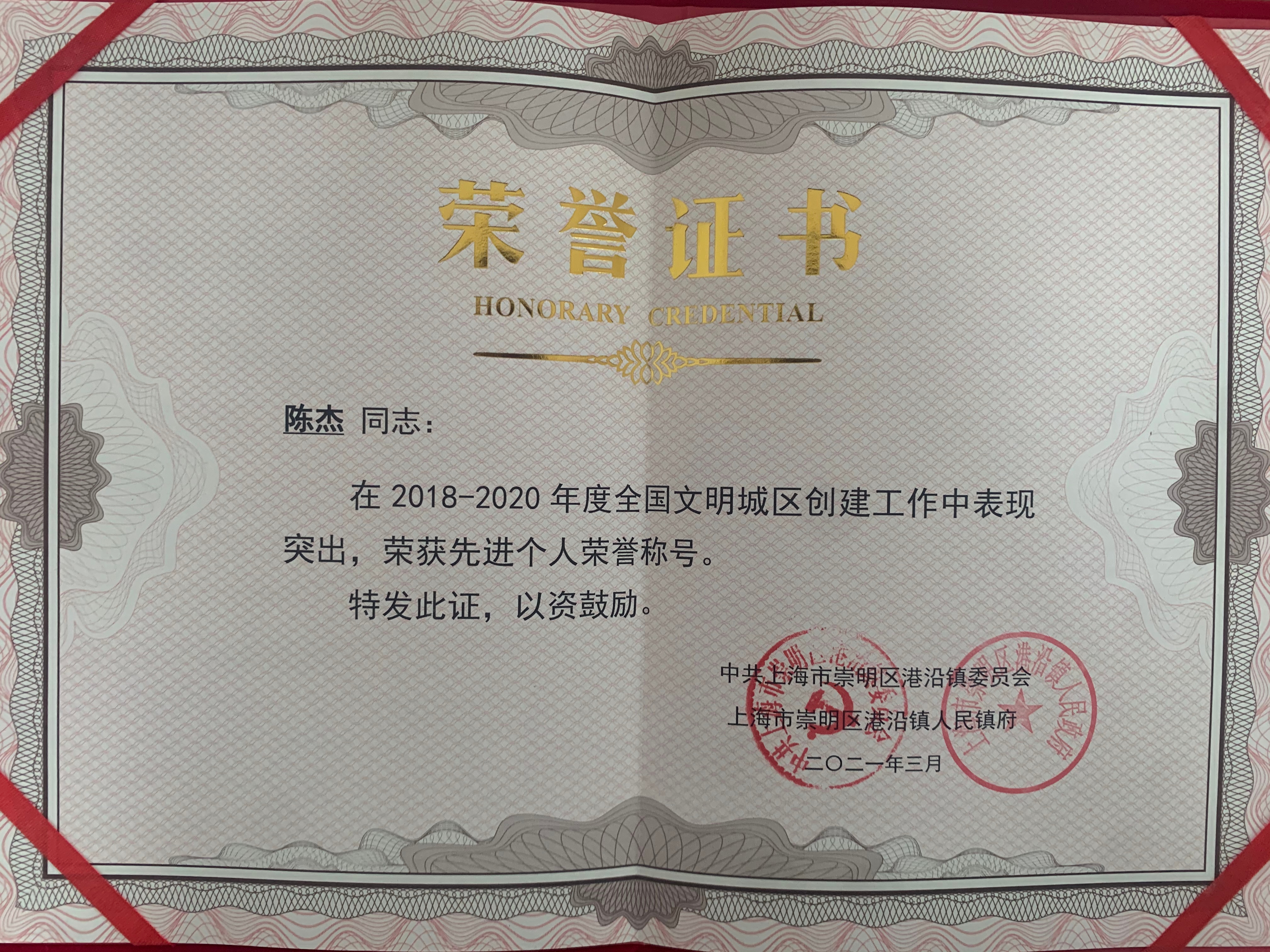 宗保公司驻港沿项目负责人陈杰在2018-2020年度全国文明城区创建工作中表现突出,荣获先进个人荣誉称号。