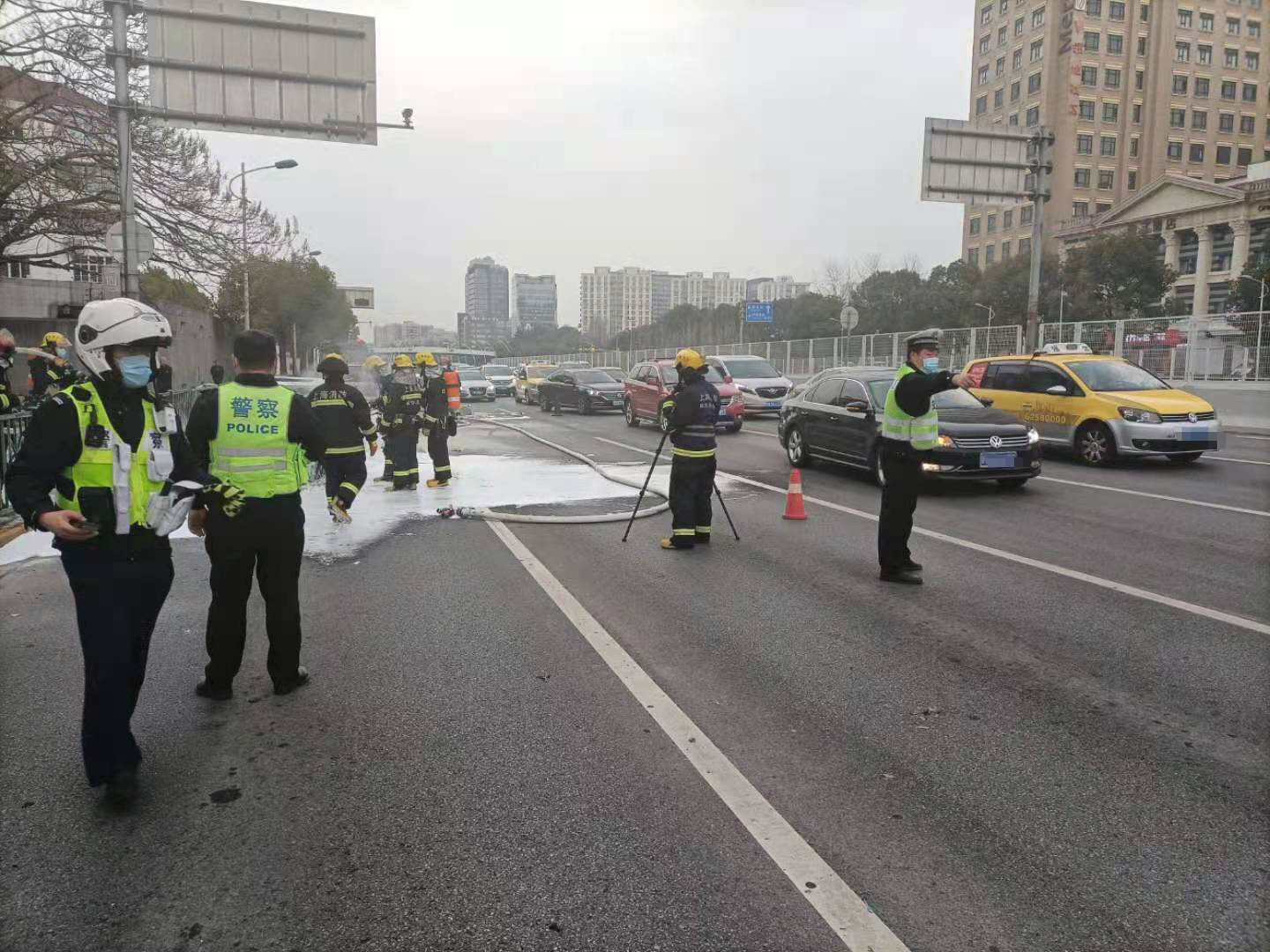 随即赶到现场的队员,配合消防和民警,对现场进行紧急疏散,引导过往车辆分流绕行,经过近半个小时的奋战终于将火扑灭。