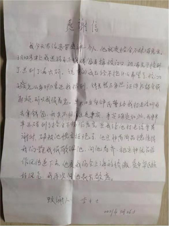 3月26日,宗保公司驻三林市容项目收到市民李女士送来的感谢信,赞扬冯四军和杜祖峰拾金不昧的行为。