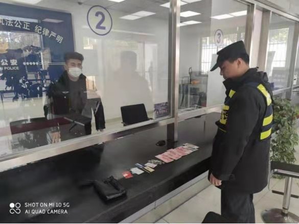 随后,杜祖峰随组长将钱包送到派出所,在民警的监督下清点物品,内有现金841元、身份证、银行卡、社保卡等证件,两人将钱包上交民警后,便悄然离开。