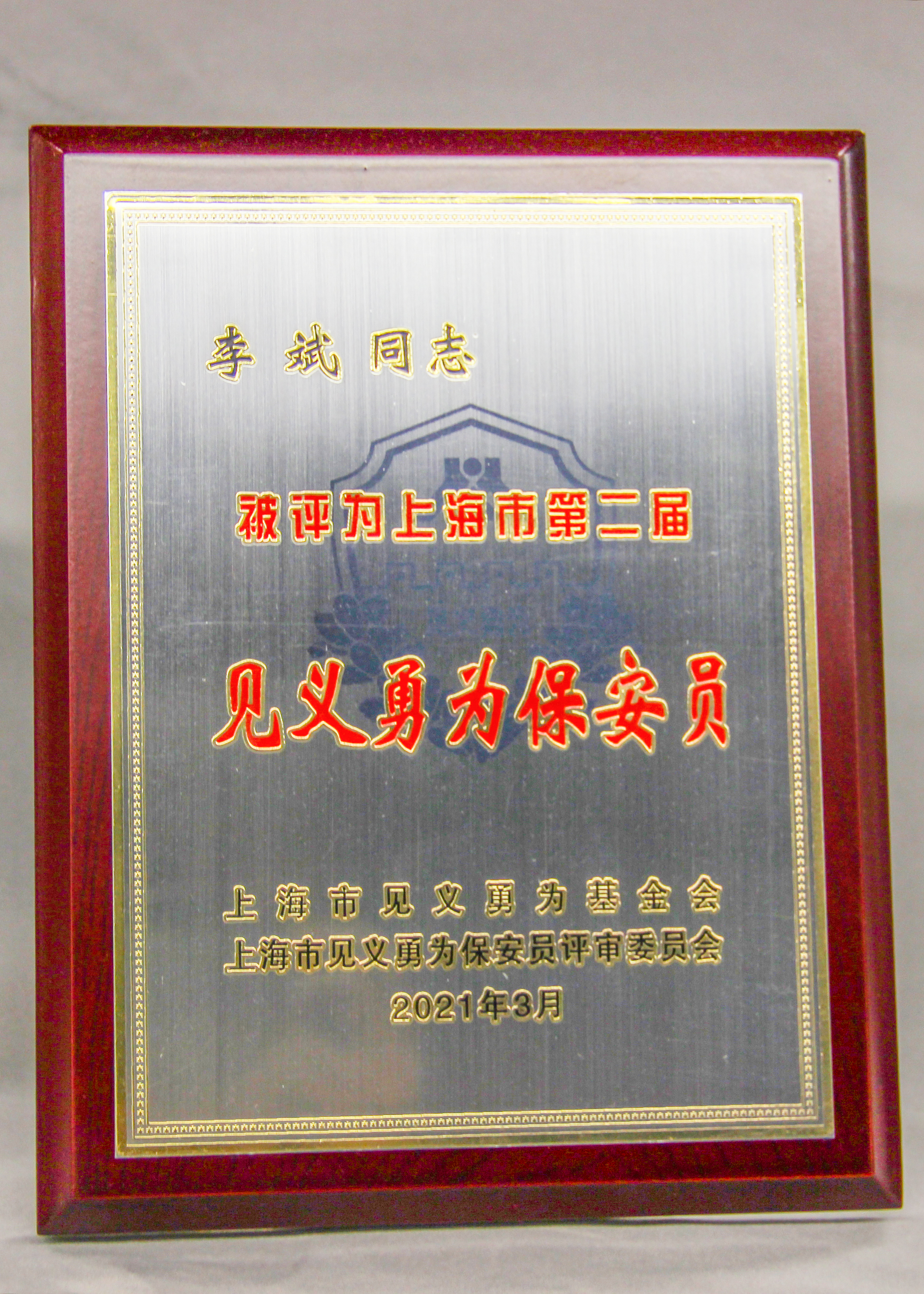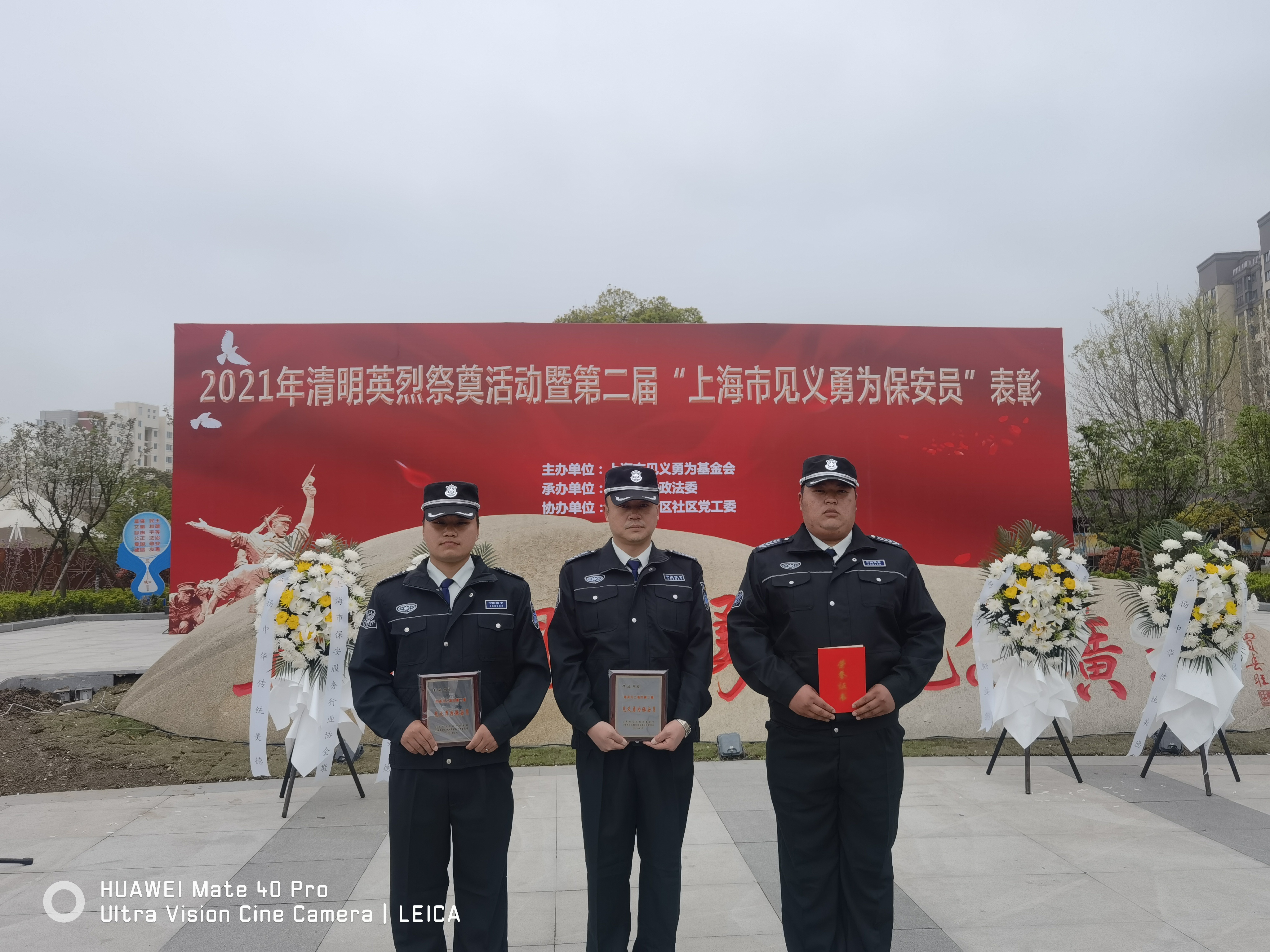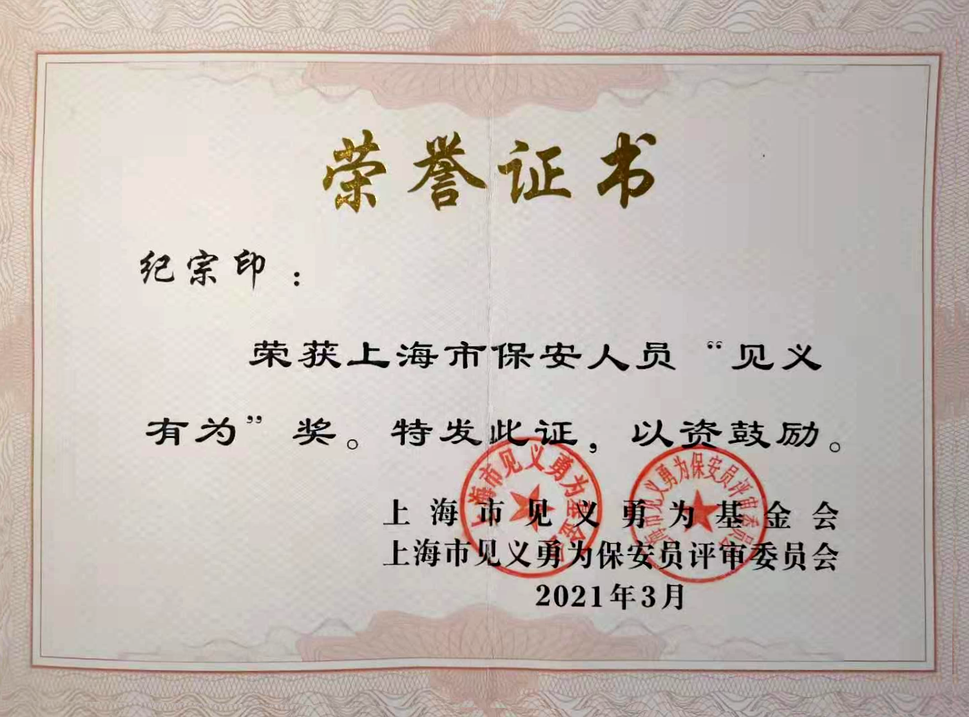 宗保公司谭波、李斌被授予“上海市见义勇为保安员”称号,纪宗印荣获上海市保安人员“见义有为”奖。