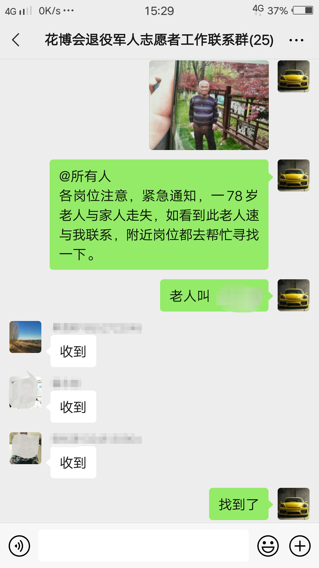 当天15:06,正在值勤的公司花博会党员志愿者梁泽迪接到游客求助,称家里78岁的老人在棕榈路观看杂技表演时不见了,老人没带手机,无法联系上他,希望梁泽迪能够帮助其找到老人。了解情况后,梁泽迪第一时间报告了负责人王留永。