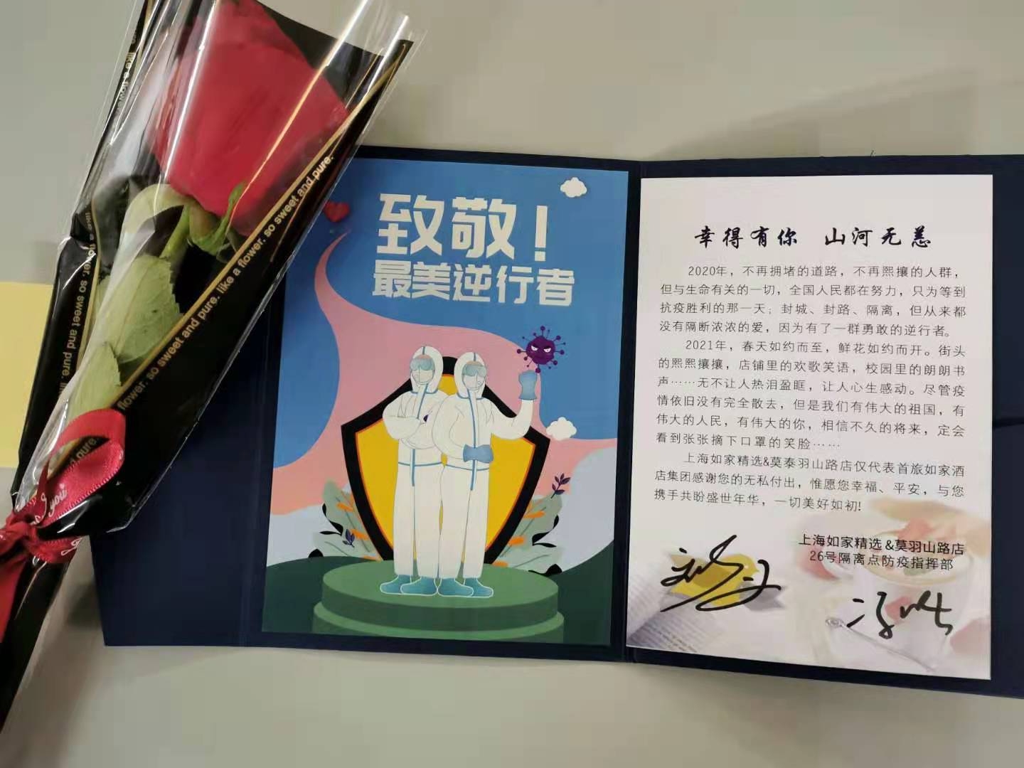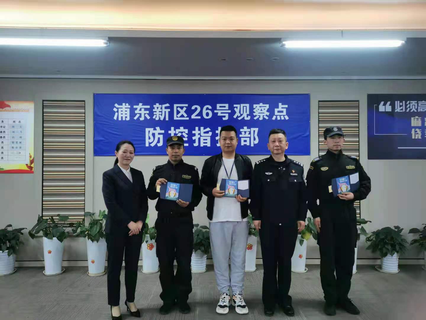 为纪念这一特别时刻,铭记这一特殊经历,疫情防控隔离的全体工勤人员进行了合影留念。洋泾派出所领导为宗保公司参与26号疫情防控隔离点的员工代表颁发了纪念册,以表示对公司26号疫情防控隔离点服务保障员工的褒扬和激励。