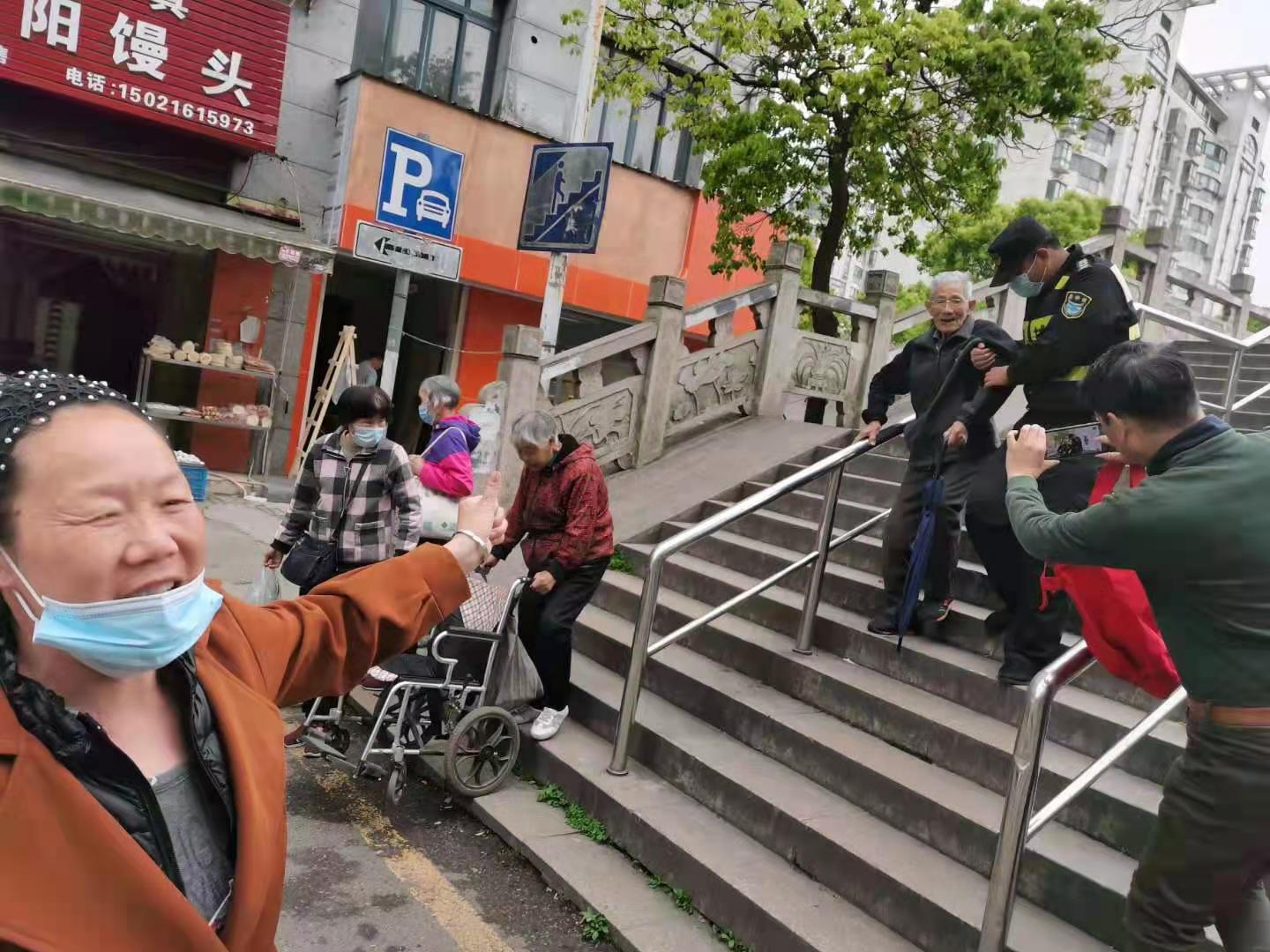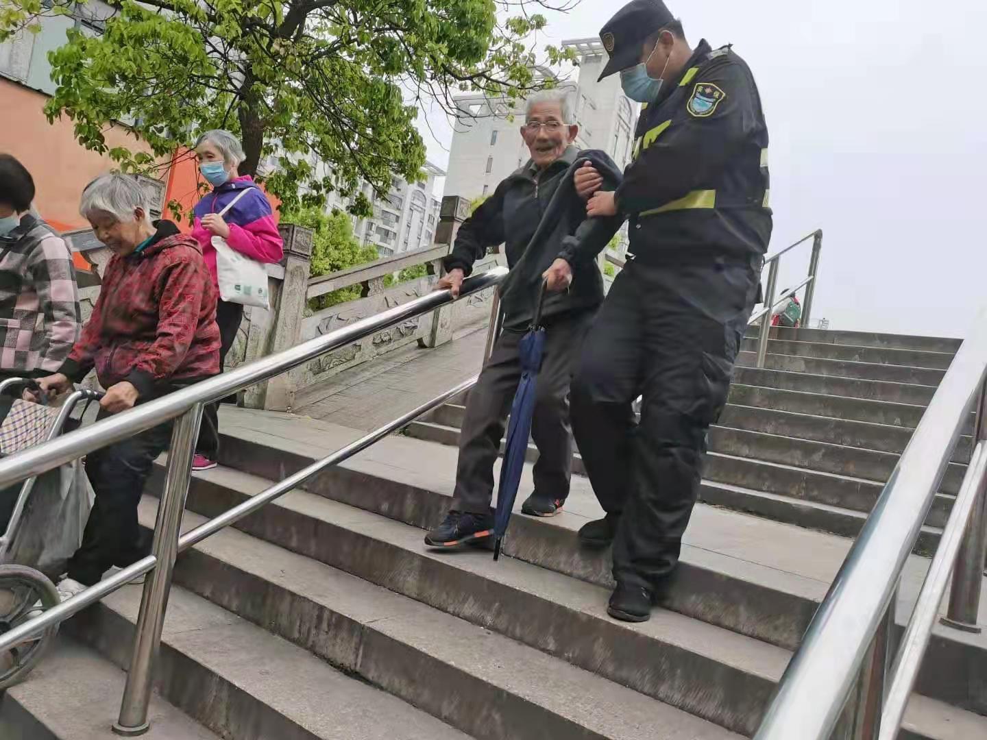 4月23日,宗保公司驻周浦市容项目队员王楷迪,搀扶老人过天桥。