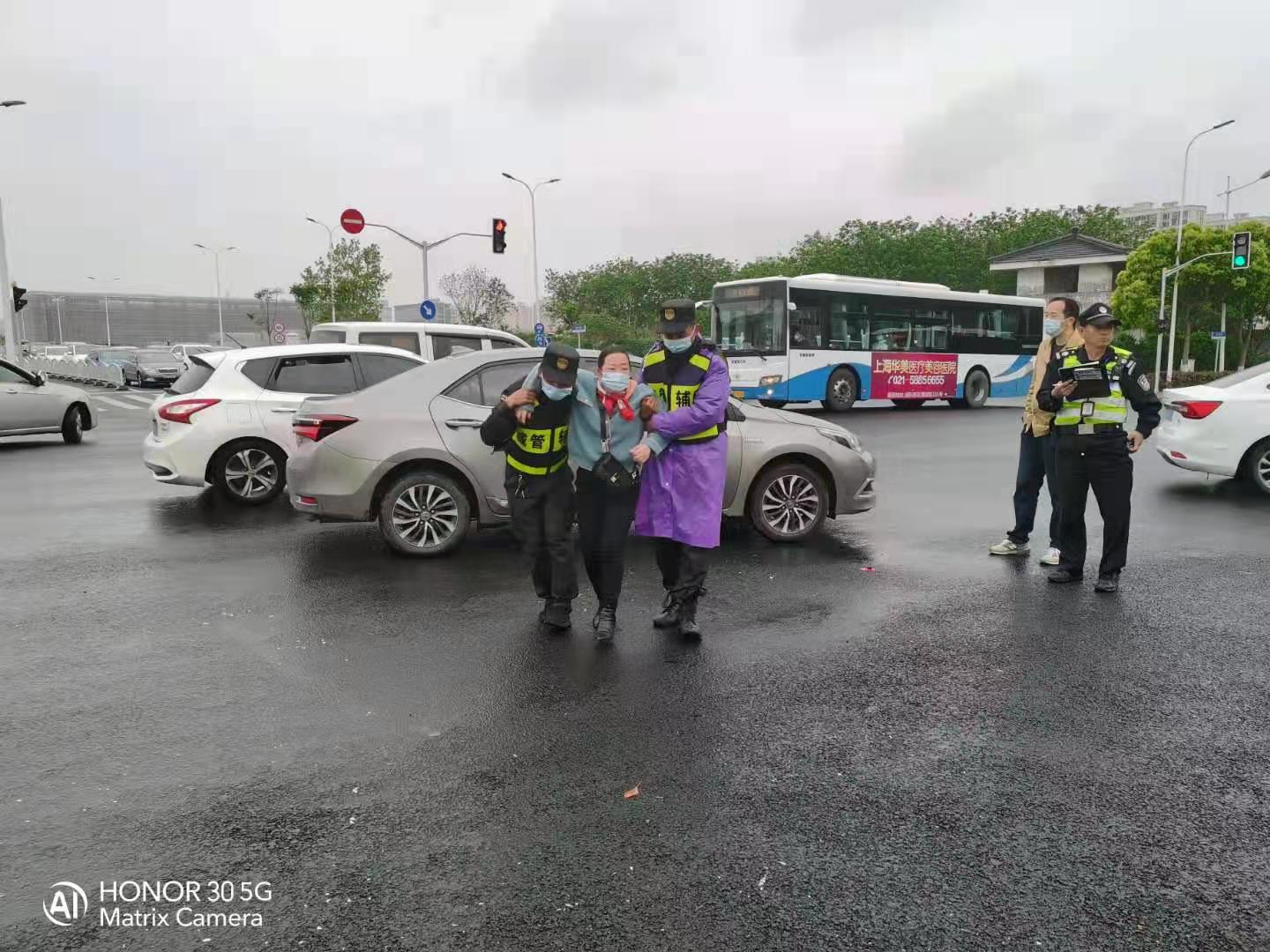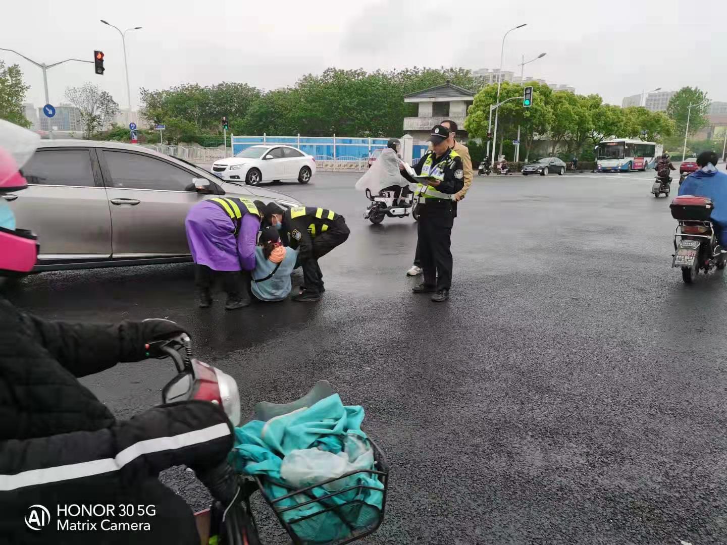 当天8:02,彭勇、李来者在周园路繁荣东路路口巡逻时,在路口遇到一起交通事故,一辆小汽车将一辆电动车撞翻,一女子倒在路口中央,车主被吓得站在一旁不知所措。两人赶紧上前询问伤者情况,被告知暂无大碍后,便扶其到路边安全地带。