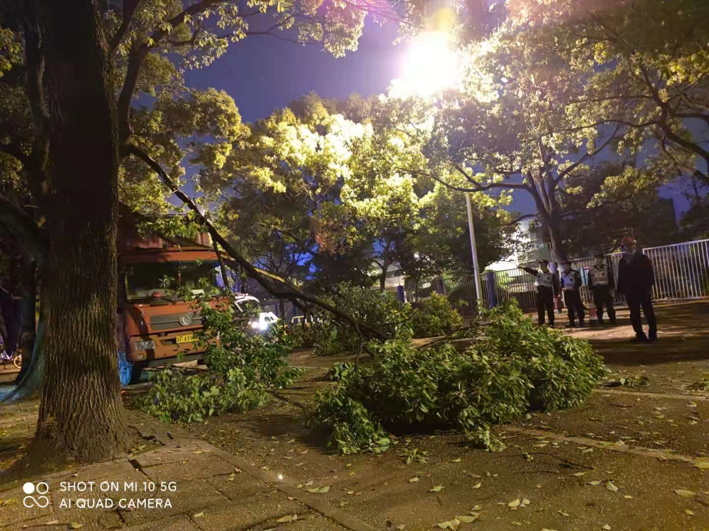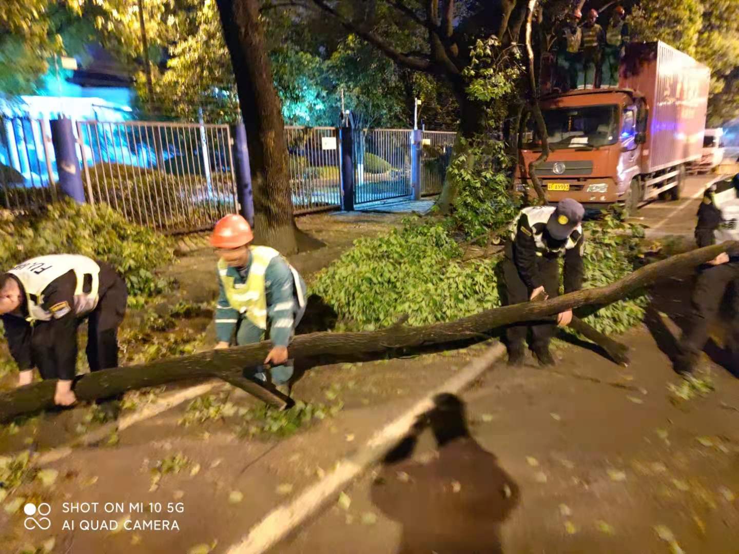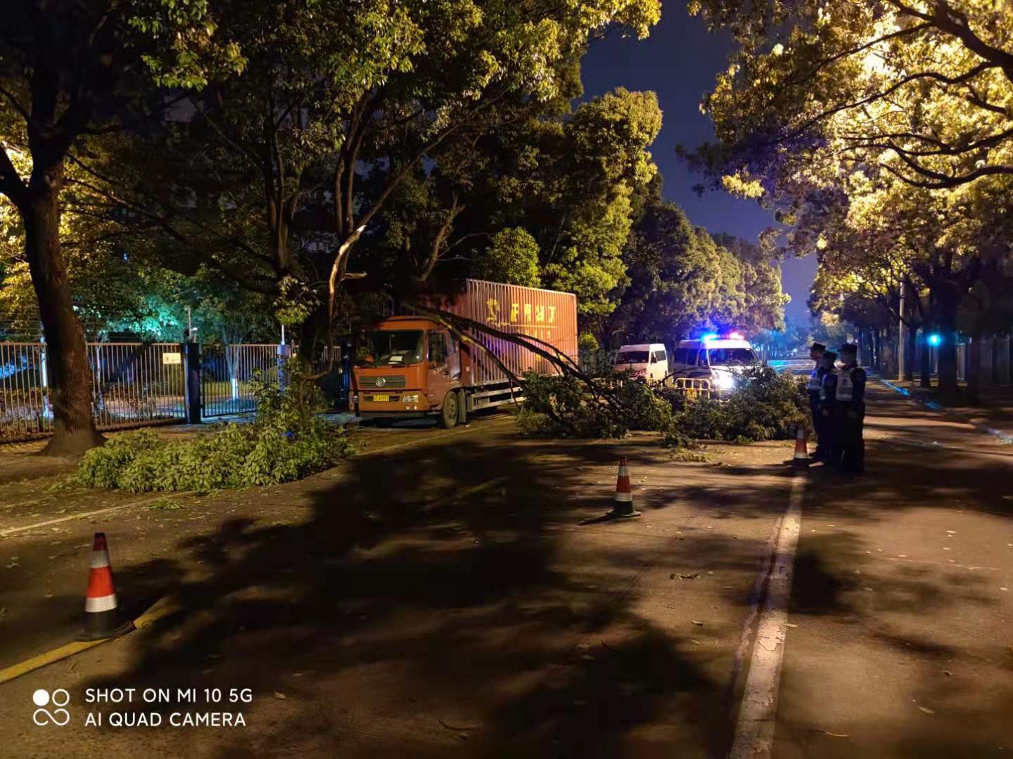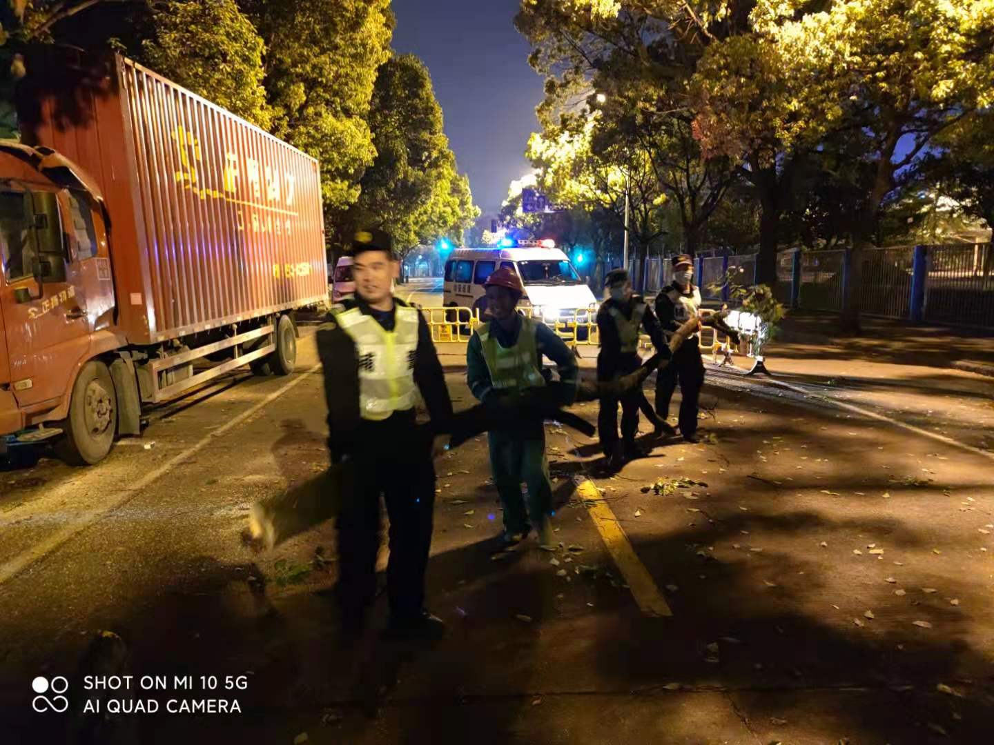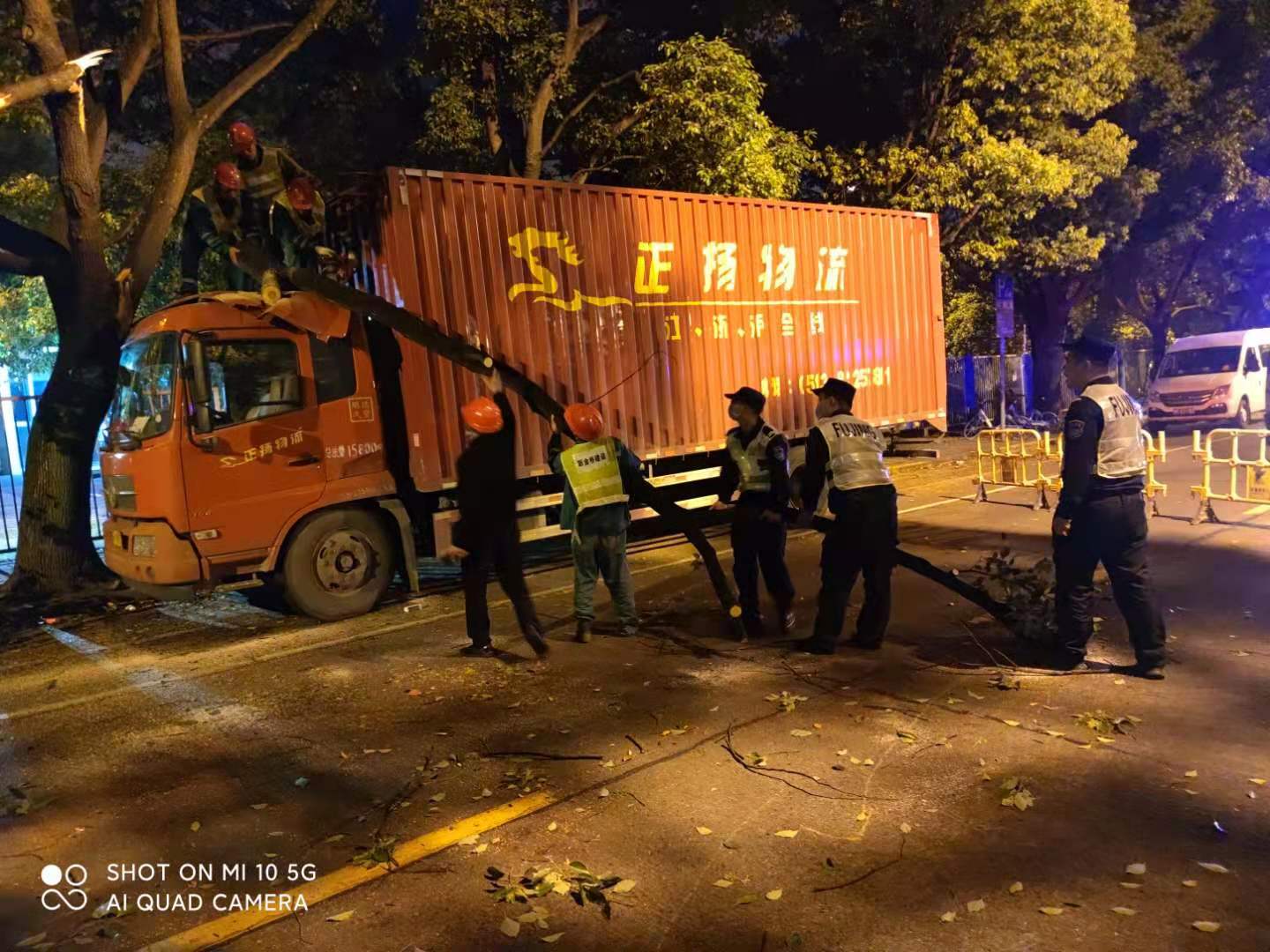 货车深夜撞大树 队员协助清路障—金桥辅警项目队员协助清理路面树枝