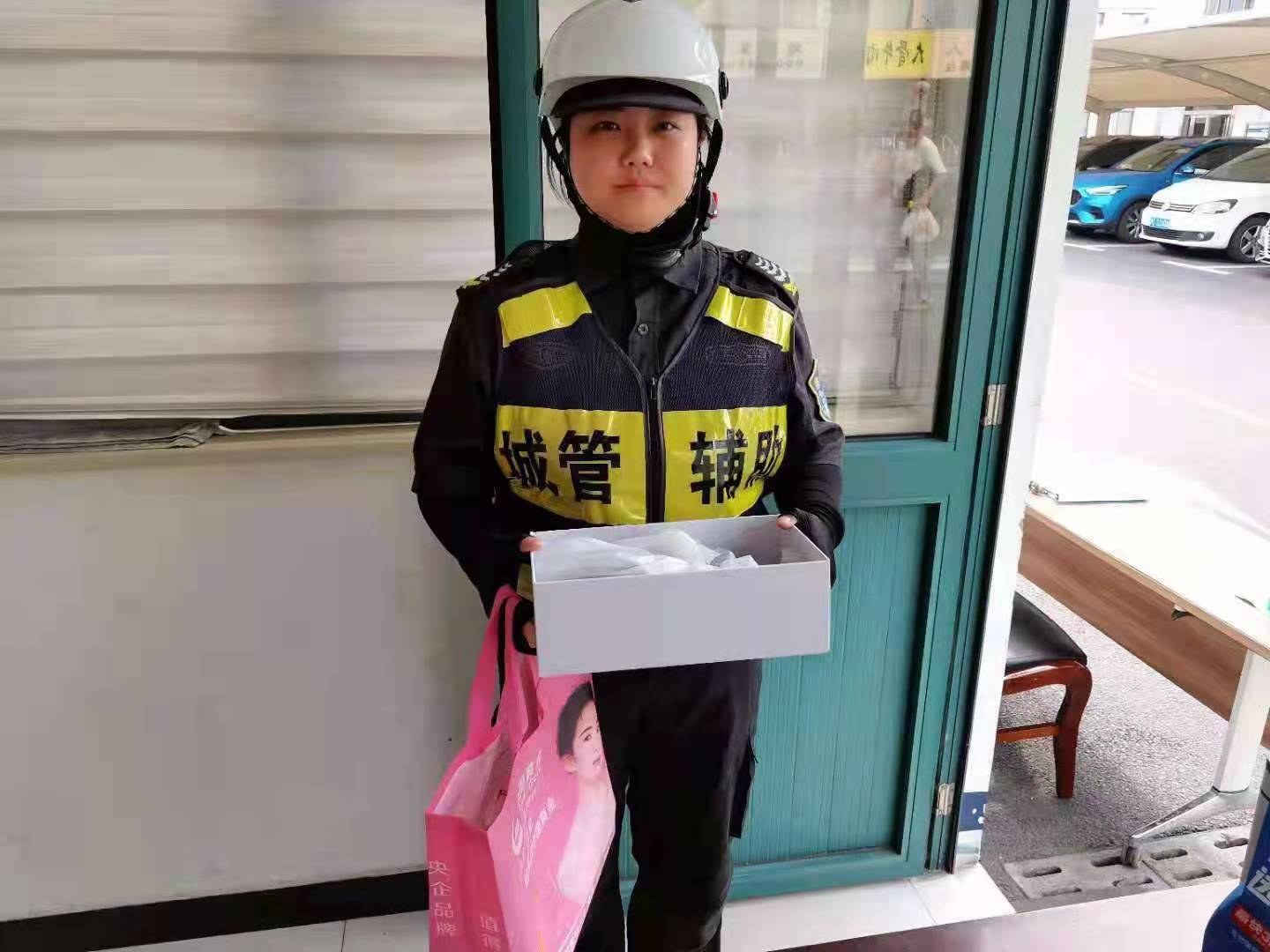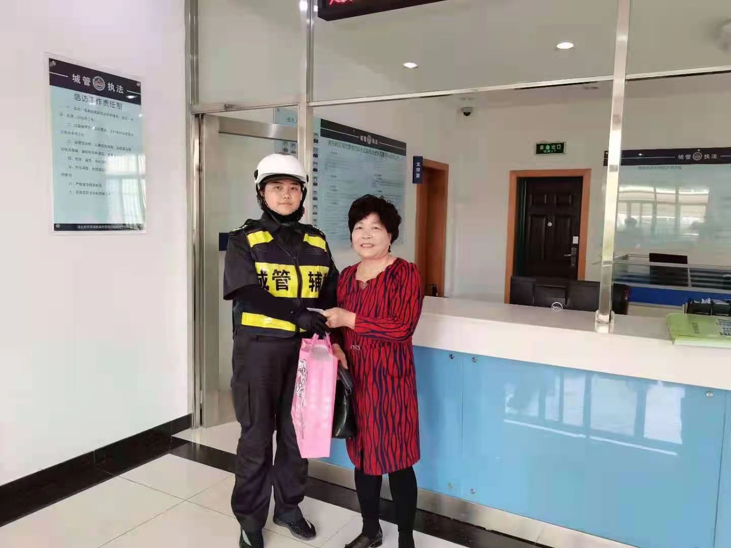 16:05左右,一位阿姨急匆匆赶来,好像是在寻找什么。曹秋霞见状,主动上前询问是不是丢了东西,阿姨说自己丢了一个手提袋,描述的袋内装的东西和她捡到的东西一模一样。确认阿姨是失主后,曹秋霞将阿姨带到周浦城管中队,把手提袋归还给了阿姨。