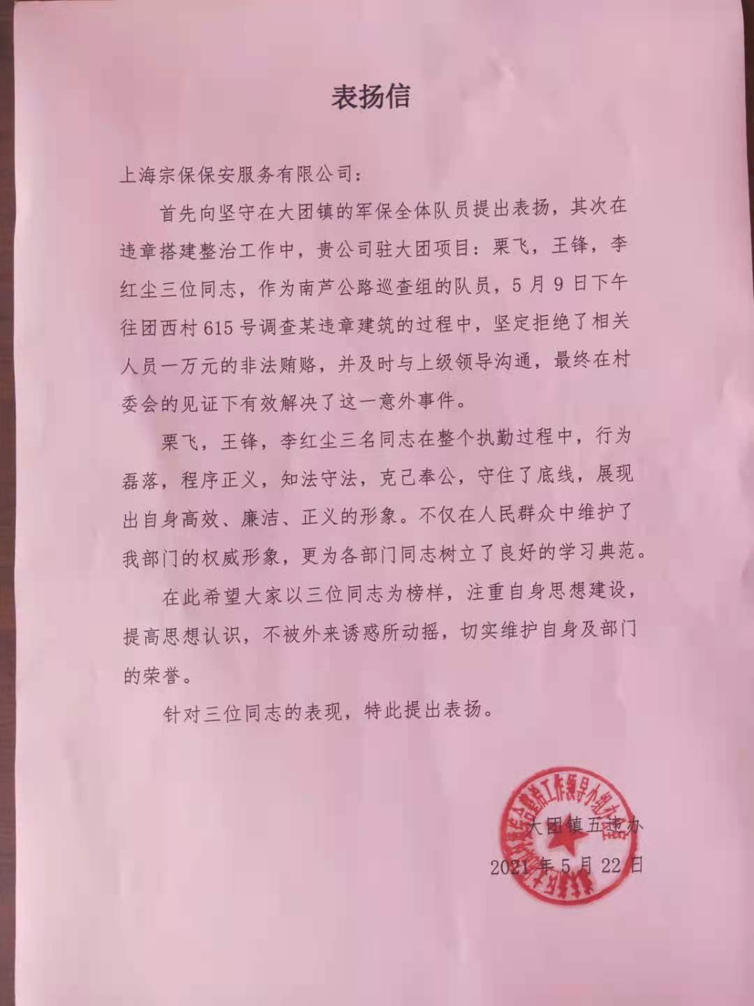 5月22日,宗保公司驻大团项目收到大团镇五违办的表扬信,信中对栗飞、王峰、李红尘等3名队员坚决拒收10000元贿赂的行为给予表扬。
