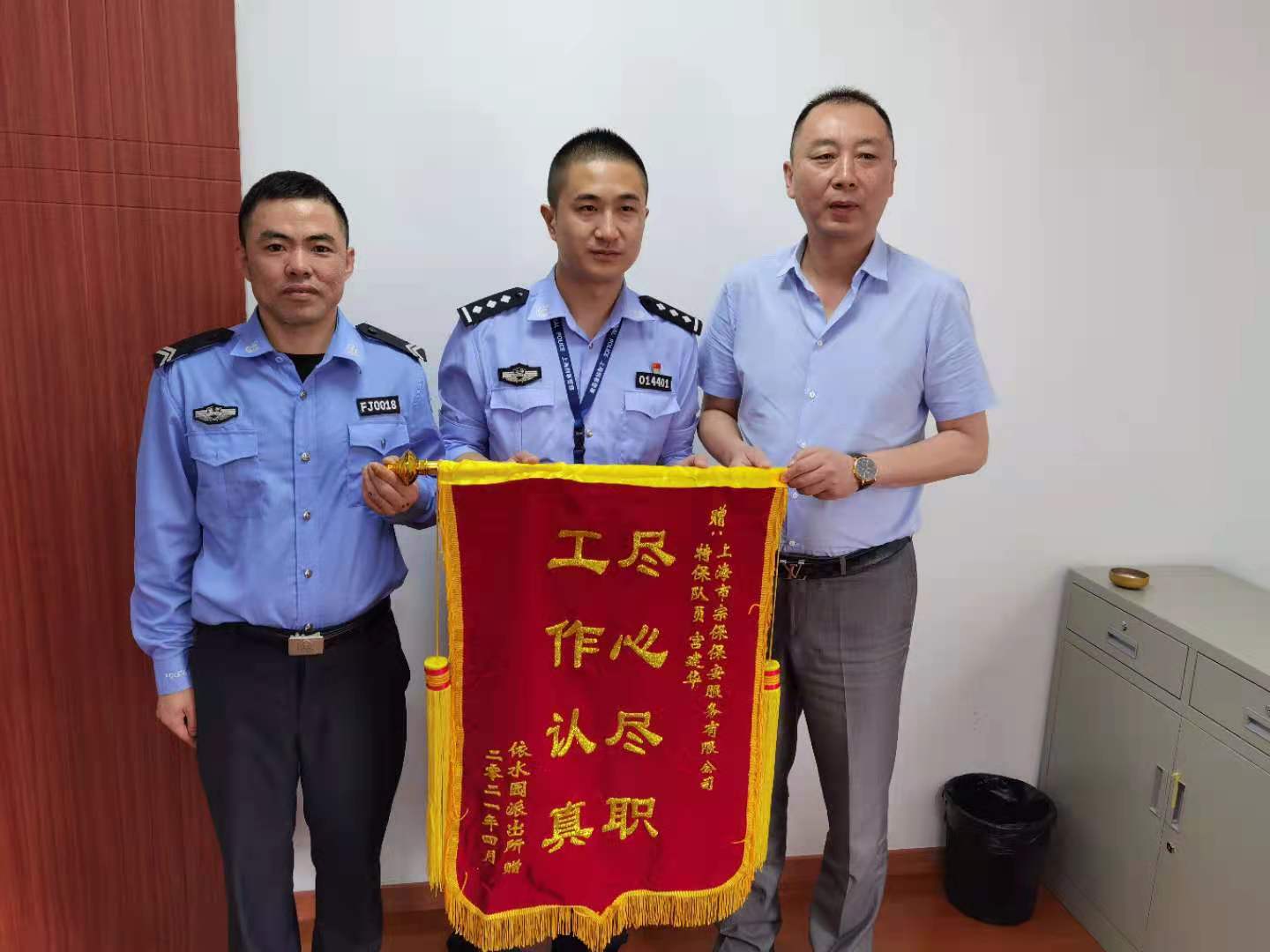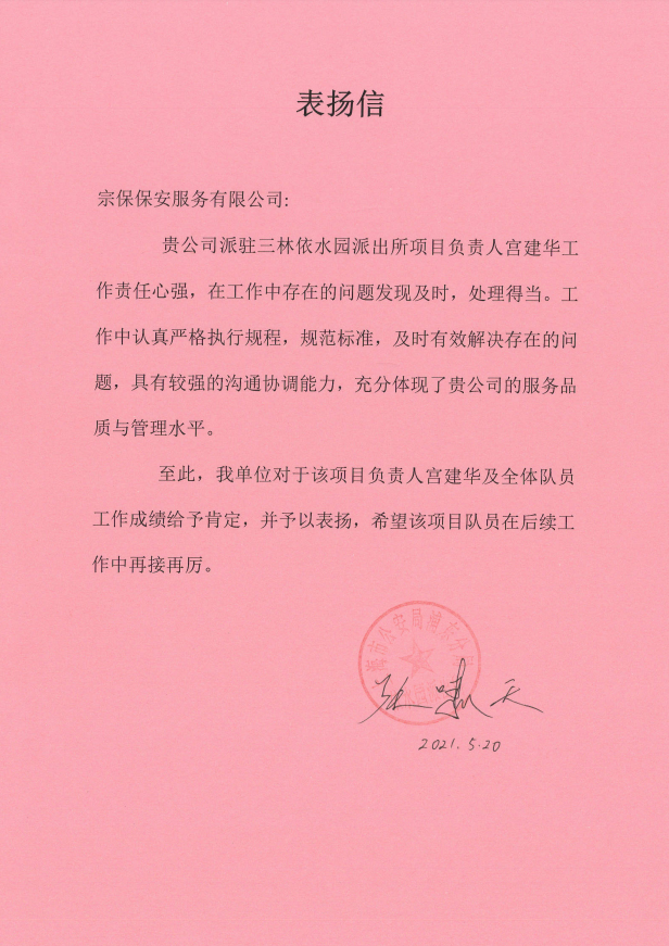 5月20日,宗保公司驻三林镇依水园派出所项目收到依水园派出所送来的一面绣有“尽心尽职 工作认真”的锦旗和一封表扬信,对兢兢业业工作的项目队员宫建华给予表扬。