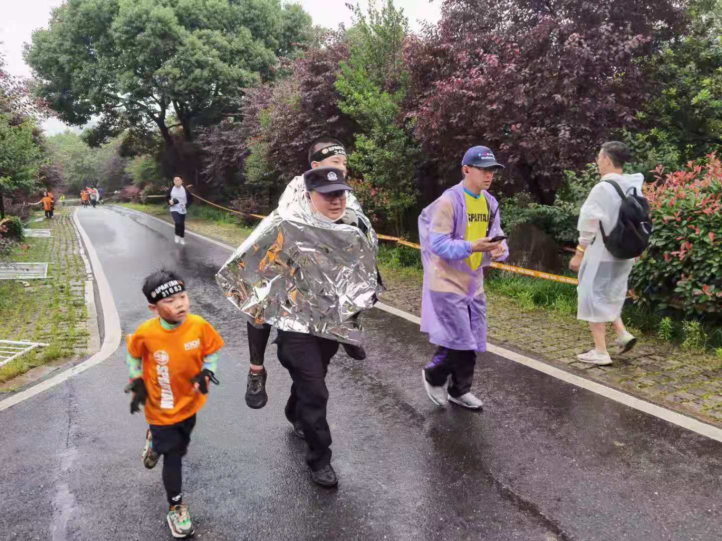 比赛中,一名“小勇士”不慎扭伤脚踝,行走困难。队员发现后,不怕辛苦、不顾风雨,一路背着这名儿童,及时将他送到赛事保障医疗车上接受治疗。