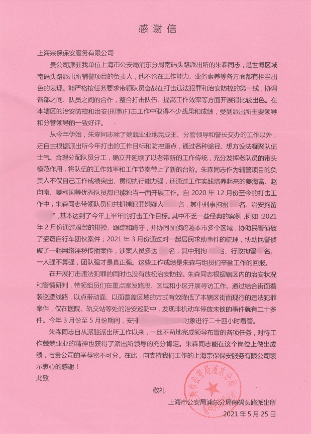 5月25日,宗保公司驻南码头路派出所辅警项目收到南码头路派出所送来的一封感谢信,信中称赞项目负责人朱森认真负责的工作态度和兢兢业业的工作精神。