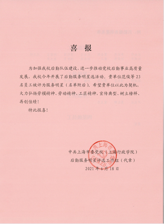 为大力弘扬劳模精神、劳动精神、工匠精神,表彰先进、树立榜样、再创佳绩,以良好的精神风貌迎接中国共产党成立100周年,6月28日,中共上海市委党校(上海行政学院)对一批后勤服务先进典型进行表彰。宗保公司范俊等23名员工被评为2021年校院后勤服务明星。