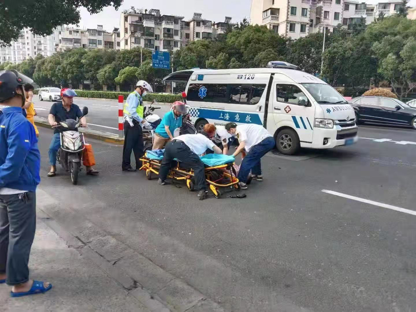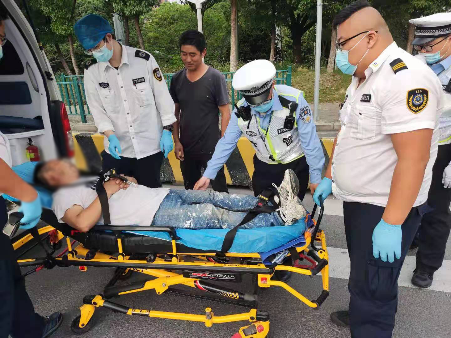 很快,救护车、交警先后赶到现场,队员们协助医护人员将男子抬上救护车,由医护人员送男子前往医院紧急救治。