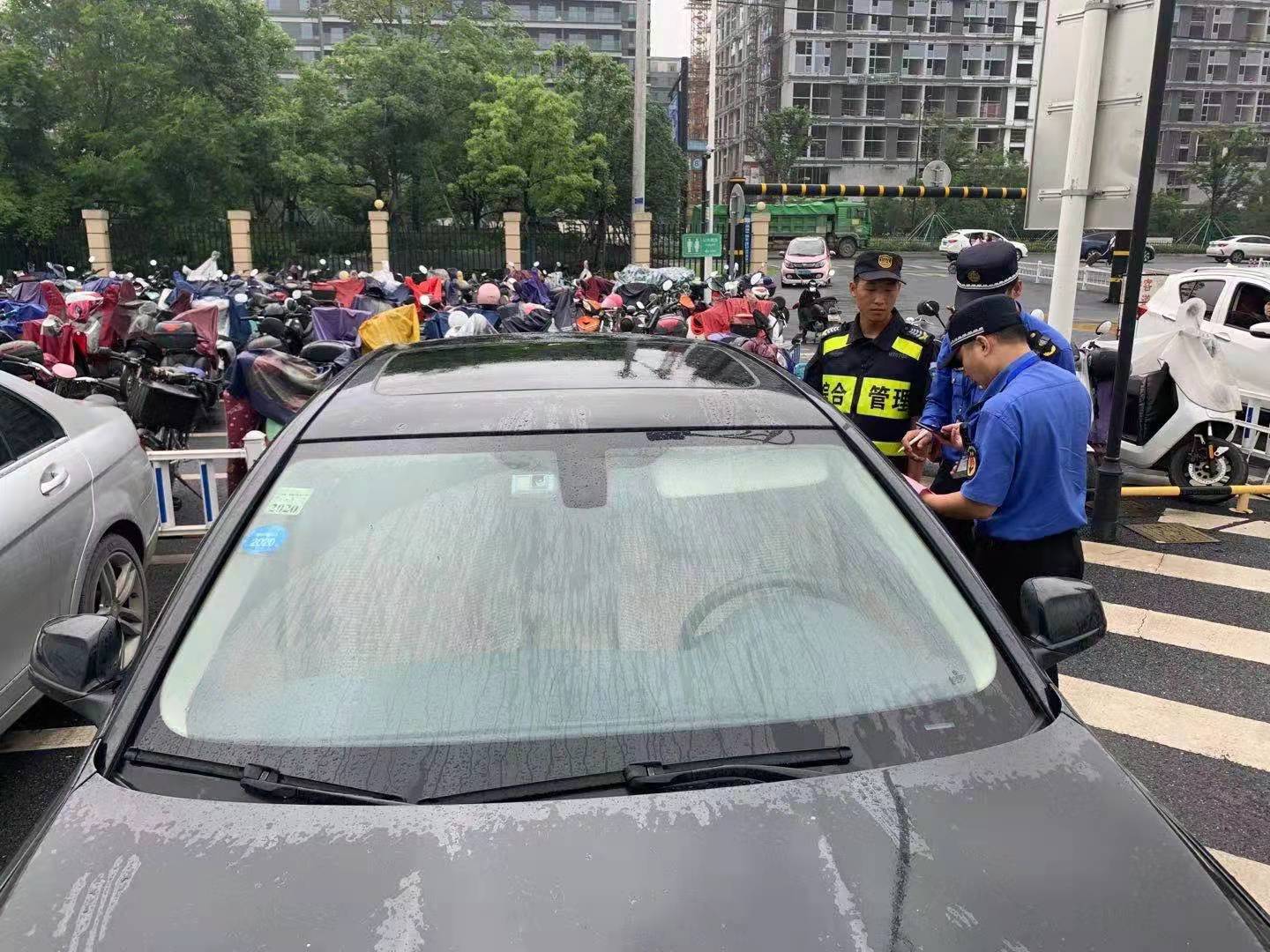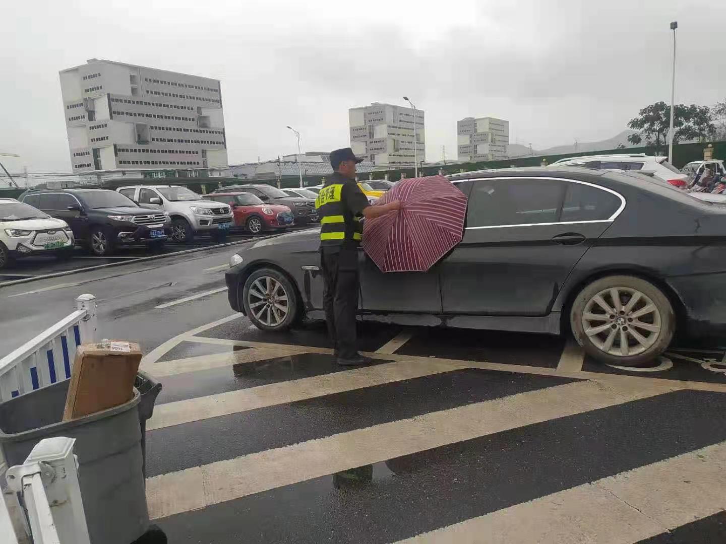 车主忘关车窗 队员撑伞挡雨—良渚地铁菜场项目队员为车撑伞挡雨