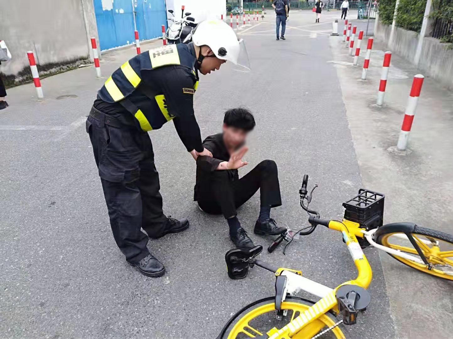 6月29日,宗保公司驻三林市容项目队员林志明和刘大旺救助骑车摔倒男子。