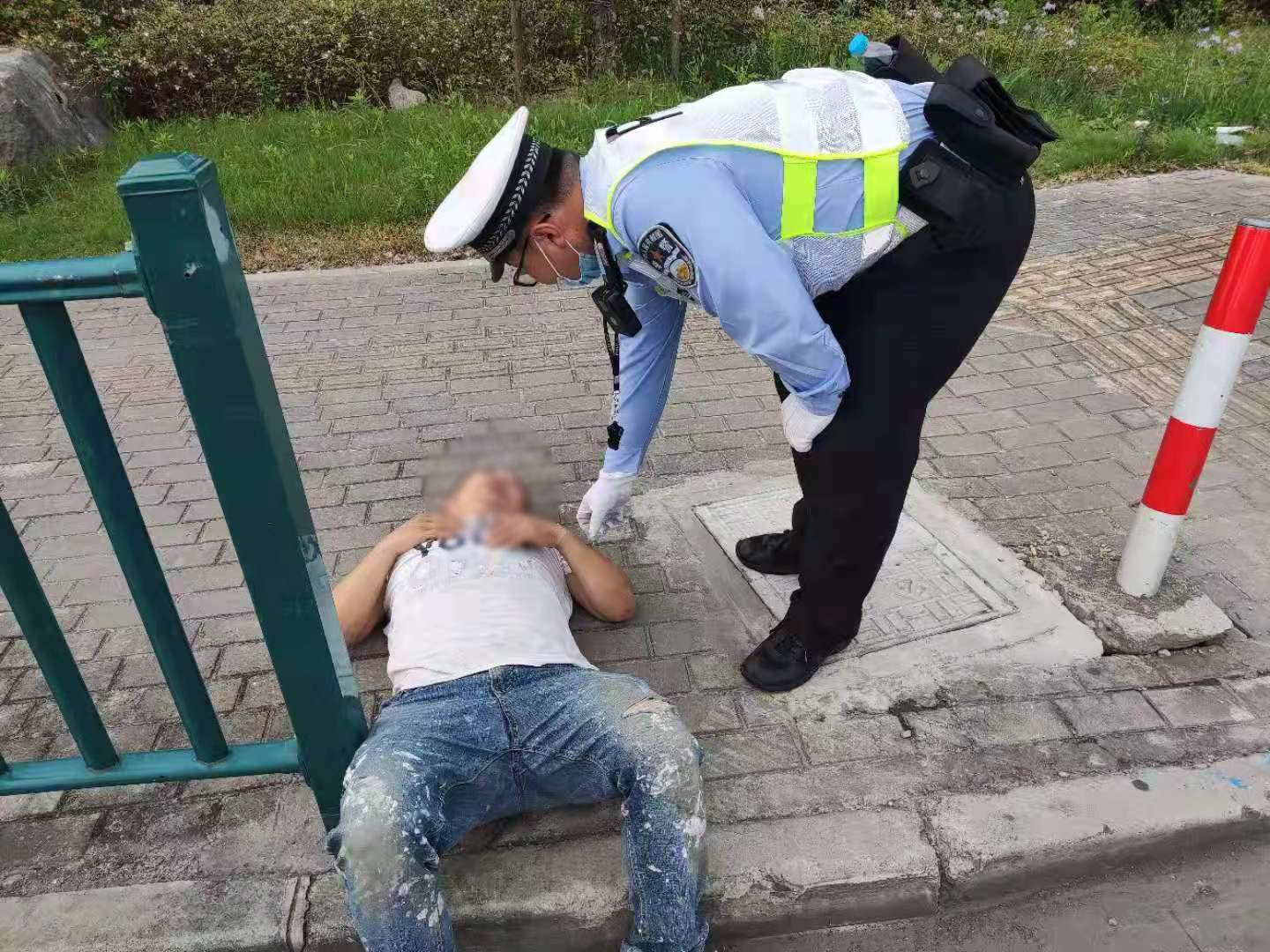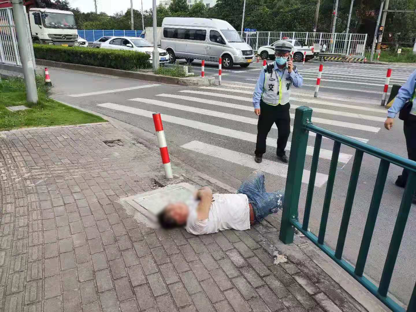 当天7:20,昝金伟、张建建巡逻至上南路联丰路路口时遇到一起交通事故,一名男子撞上了路边的标识杆,一动不动地躺在机动车道上。