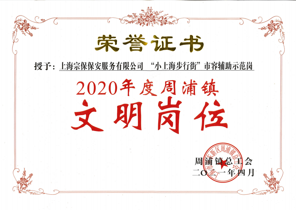 为进一步弘扬劳模精神、劳动精神、工匠精神,近日,周浦镇总工会对一批先进集体和先进个人进行了表彰。宗保公司“小上海步行街”市容辅助示范岗荣获周浦镇文明岗位称号。
