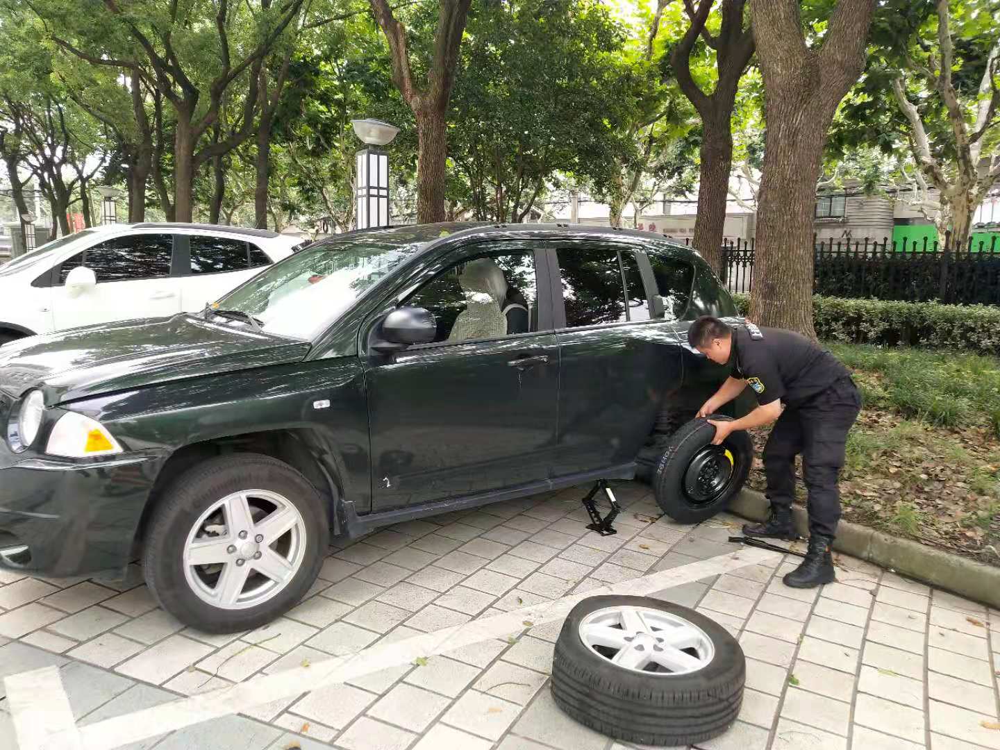 当天7:00,项目组长许志刚在校内巡逻时,发现北门停车场有位男子一直在徘徊,便立即上前询问。原来这位男子是来党校参加“哲社班”培训的学员,车子后轮被钉子扎破,完全没气无法行走,一时找不到维修师傅,心理十分着急。
