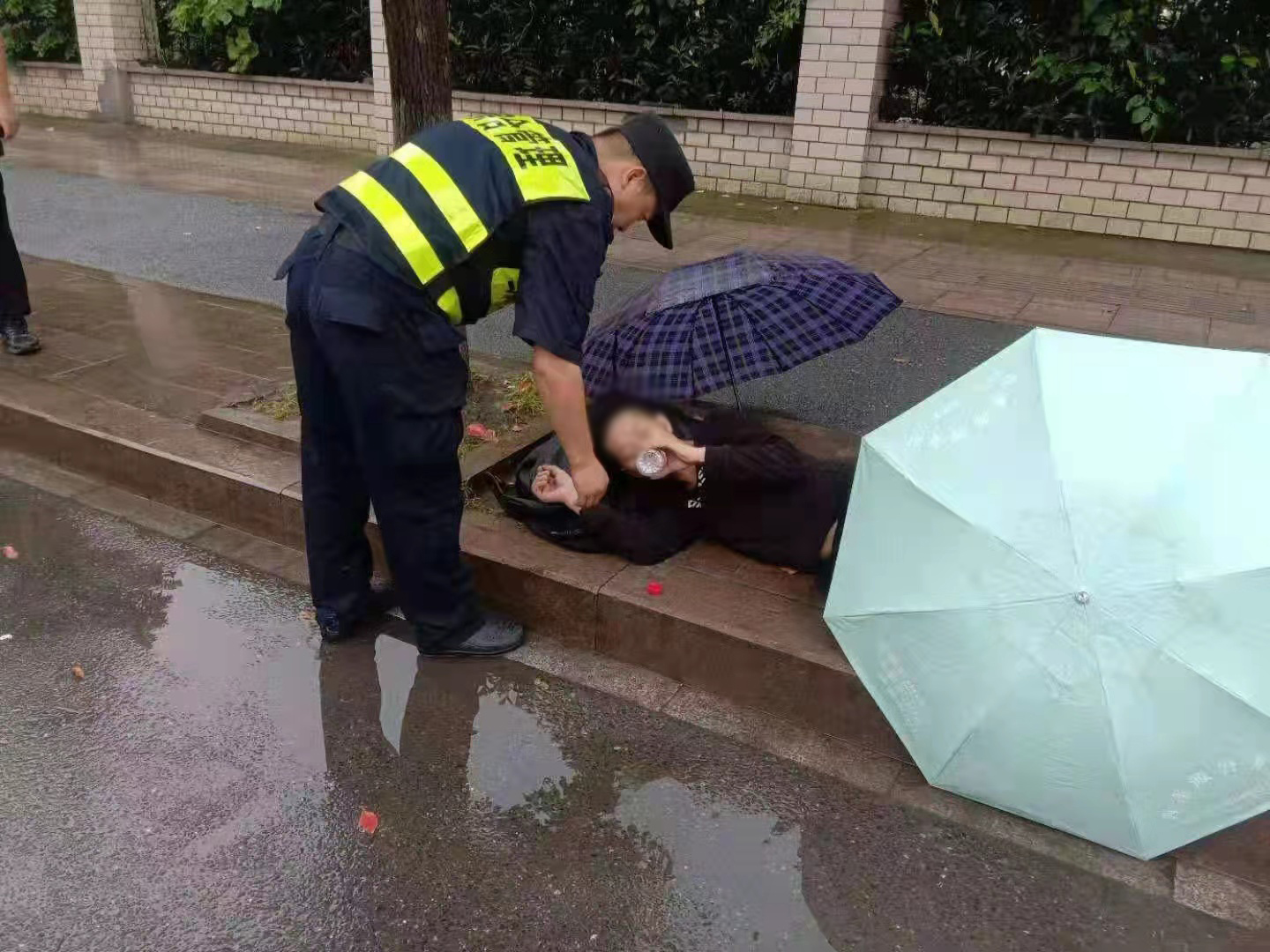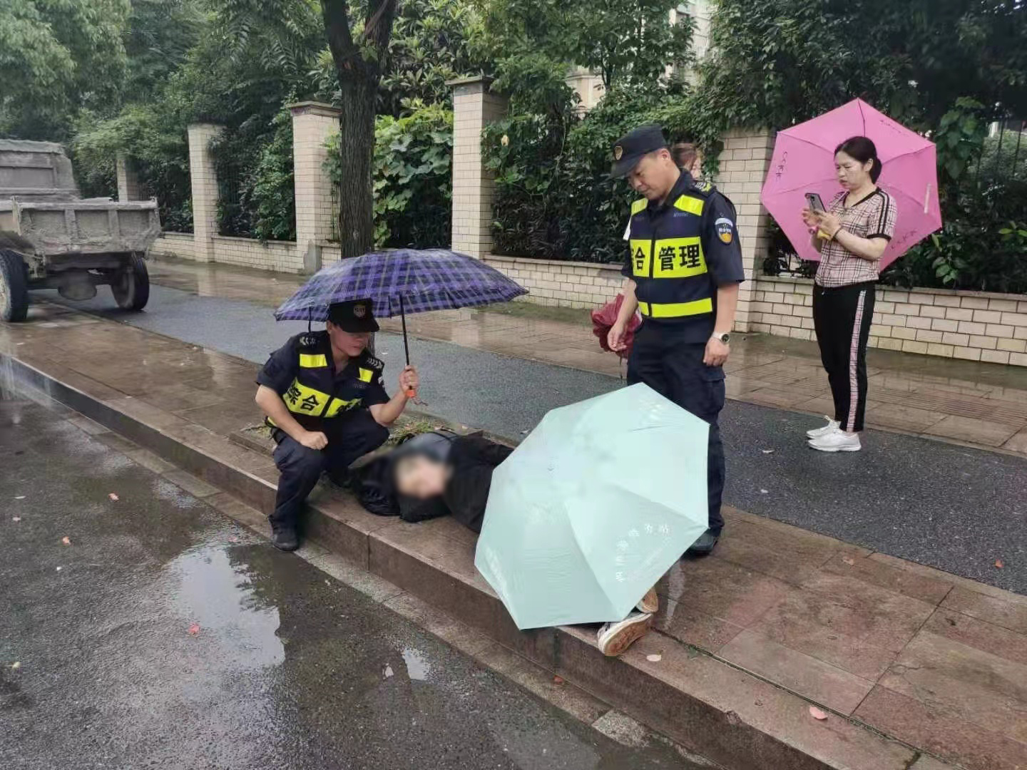 张腾刚走近男子就闻到一股浓烈的酒味,吕剑强尝试叫醒男子,但醉酒男子没有反应。此时正在下雨,两人便撑起雨伞为其遮雨,并将情况向组长报告。