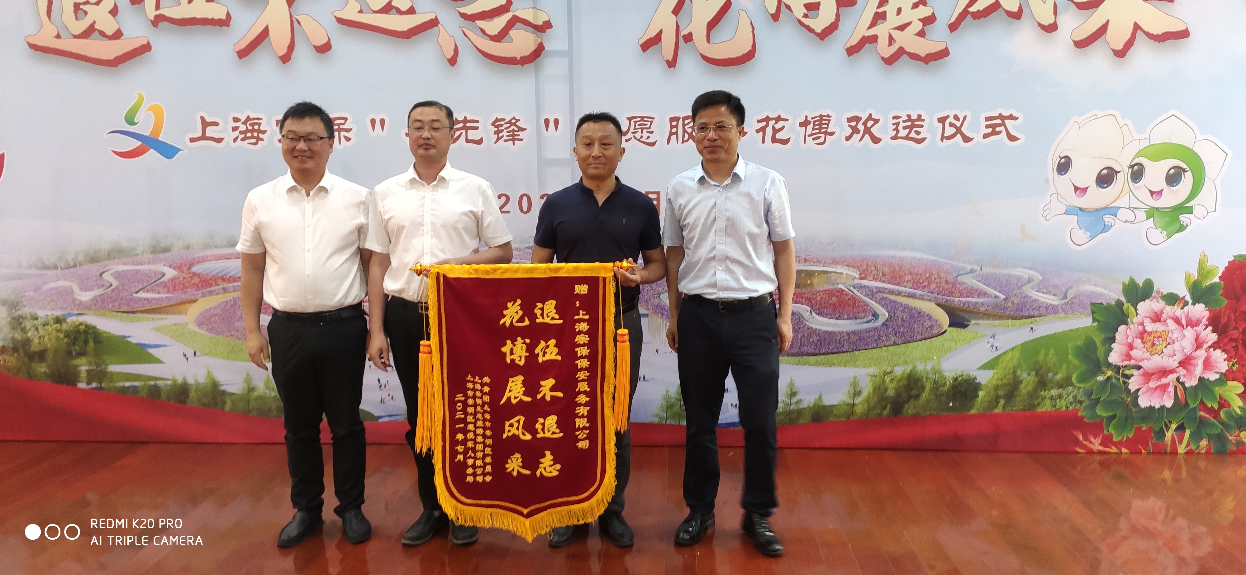 崇明区退役军人事务局举行专题欢送仪式,向宗保公司退役军人志愿服务队人员颁发“兵先锋”志愿者服务证书,向宗保公司赠送一面绣有“退伍不退志、花博展风采”锦旗,是对公司全体退役军人志愿队服务人员工作精神、工作标准、工作成效的充分肯定,树立了宗保公司积极履行社会责任,承担社会义务的良好形象。