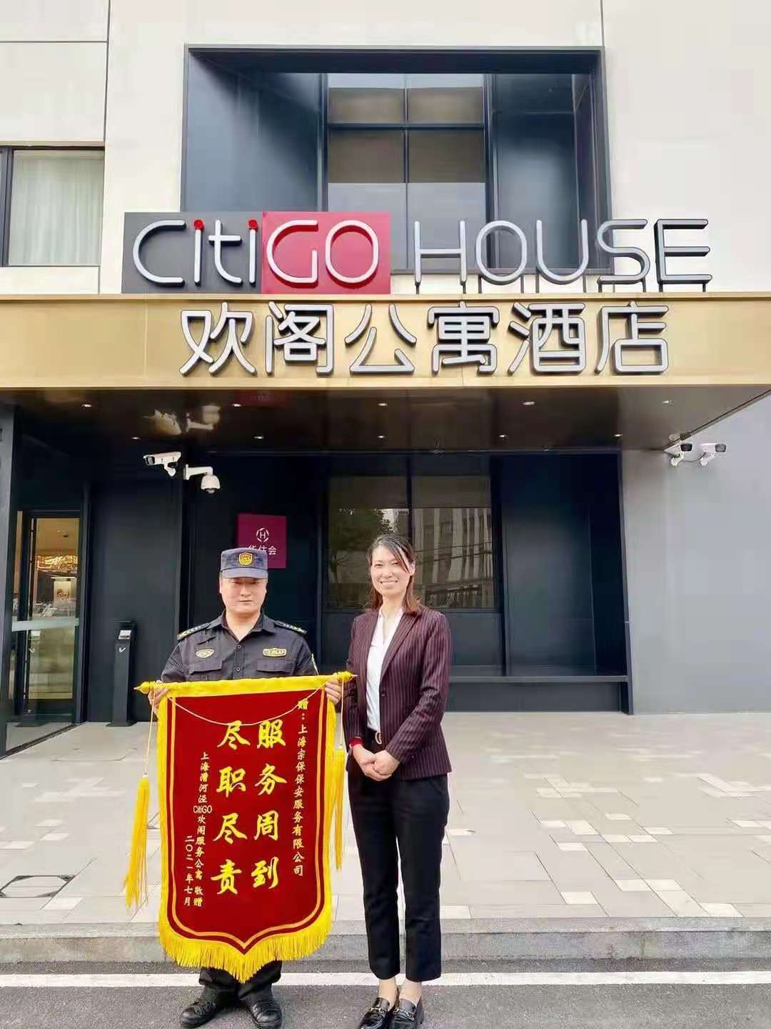 7月12日,宗保公司驻徐汇区欢阁公寓酒店项目收到酒店赠送的绣有“尽职尽责 服务周到”的锦旗,对宗保公司队员们的工作给予充分肯定和感谢。