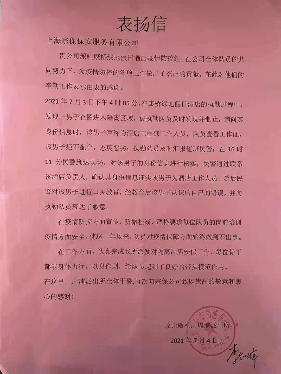 7月4日,宗保公司驻周浦辅警项目收到周浦派出所送来的一封表扬信,信中对公司驻疫情防控组全体队员的辛勤付出提出表扬。