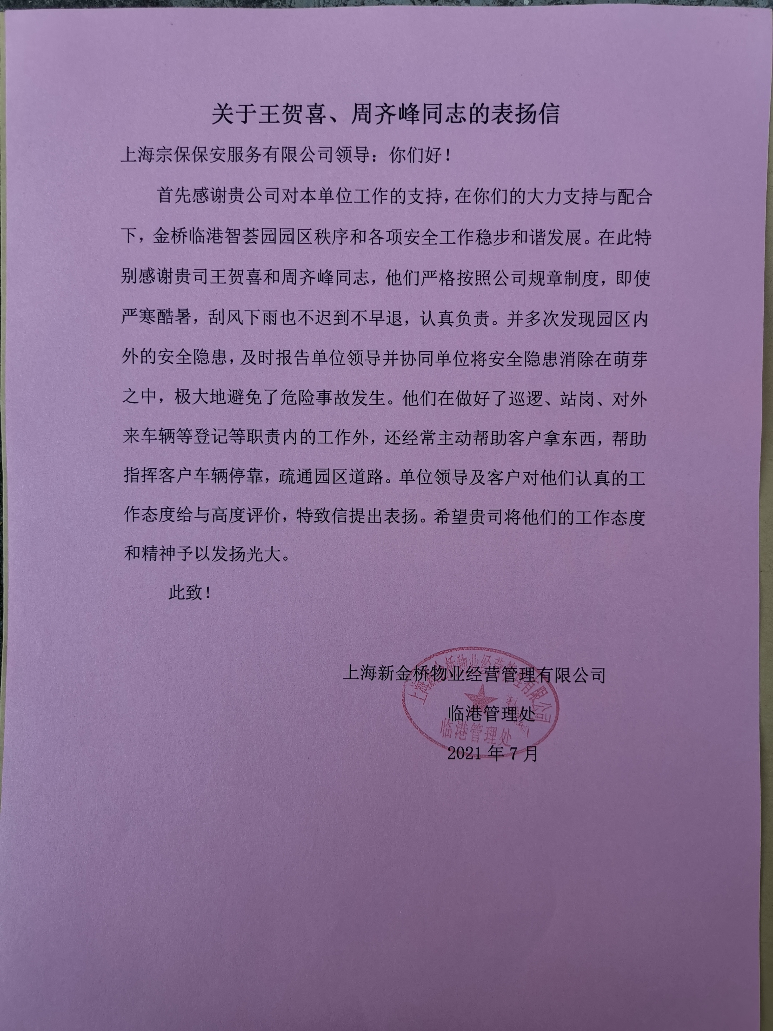 7月14日,宗保公司驻金桥临港智荟园项目收到上海新金桥物业经营管理有限公司送来的一封表扬信,信中对王贺喜、周齐峰两名队员提出表扬。