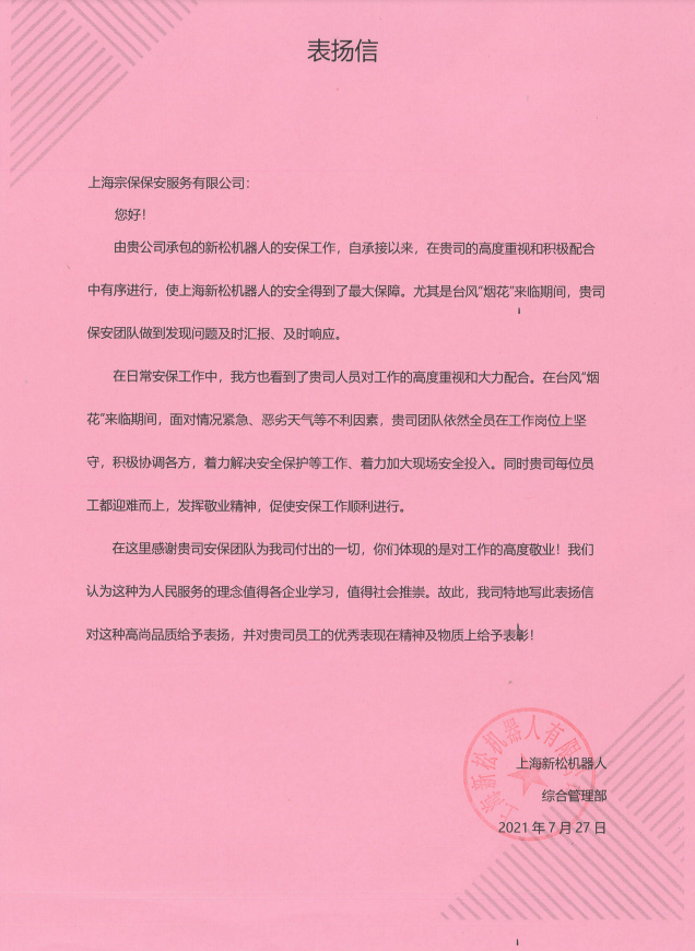 公司驻新松机器人安保项目受到甲方表扬,得益于甲方的信任和支持,更离不开宗保队员们的辛劳和付出。全体宗保人将珍惜荣誉、再接再厉,努力完成好甲方赋予的每项工作任务。