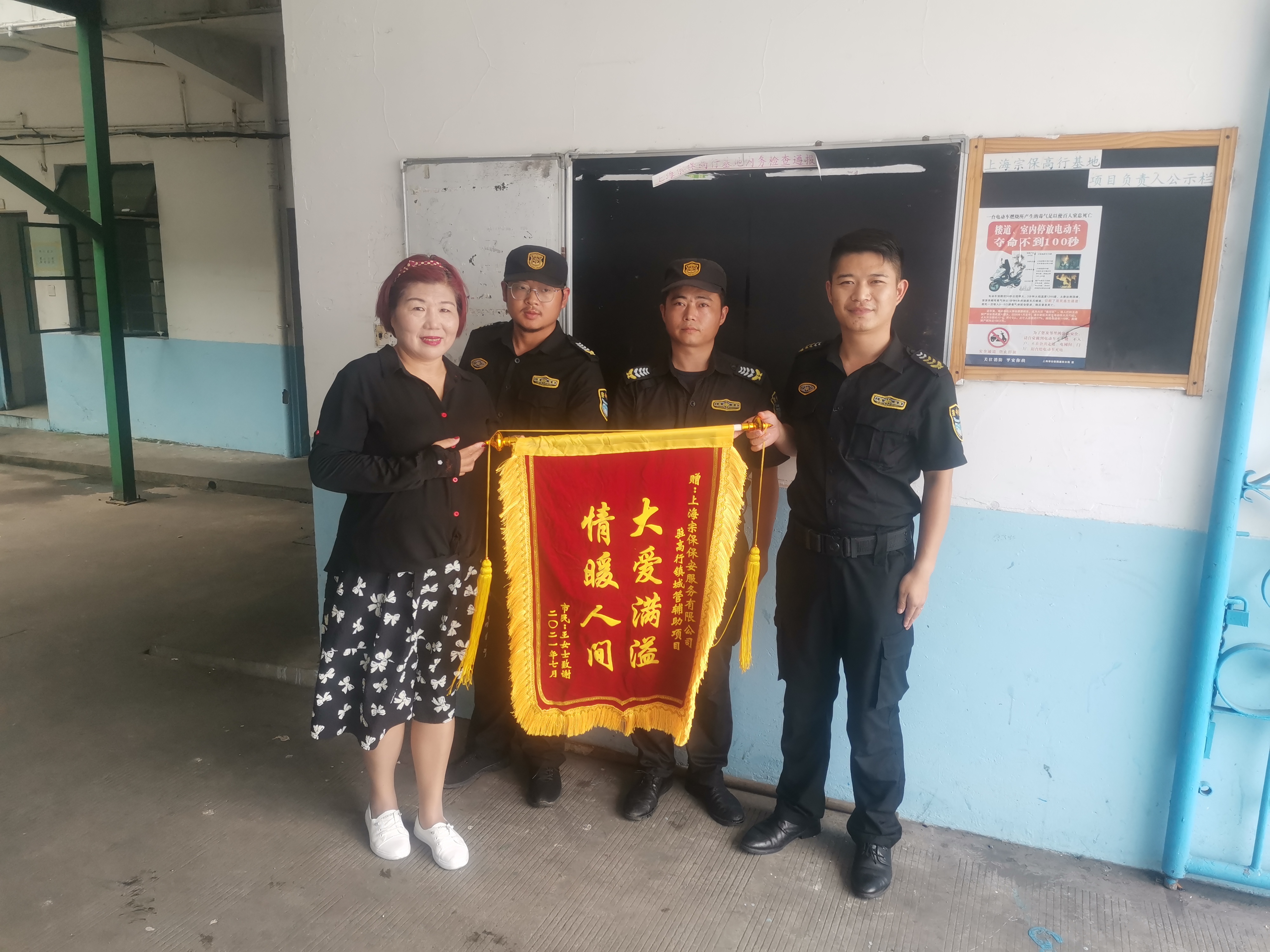 7月29日,市民王女士将一面绣有“大爱满溢 情暖人间”的锦旗送到宗保公司驻高行市容项目队员顾俊、蒋云程、苏开志的手中,感谢他们3人热心助人的行为。