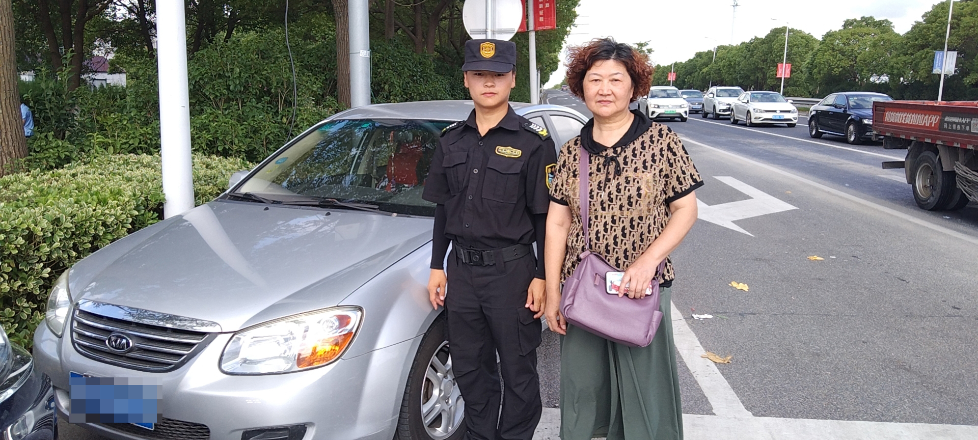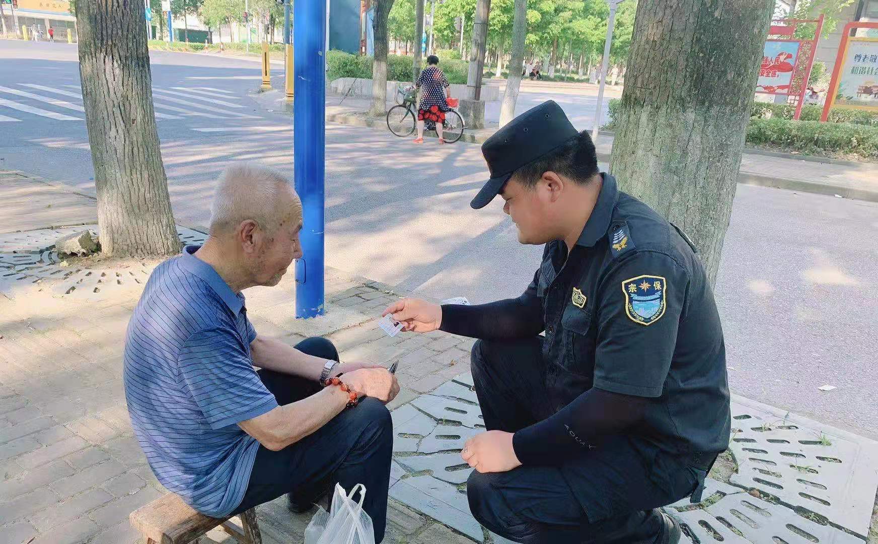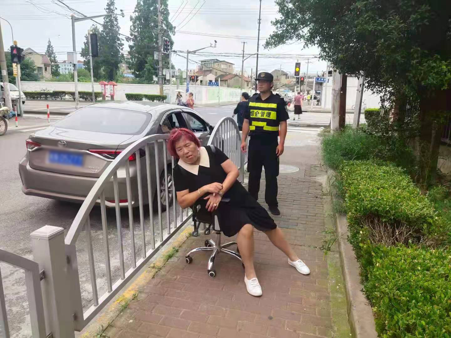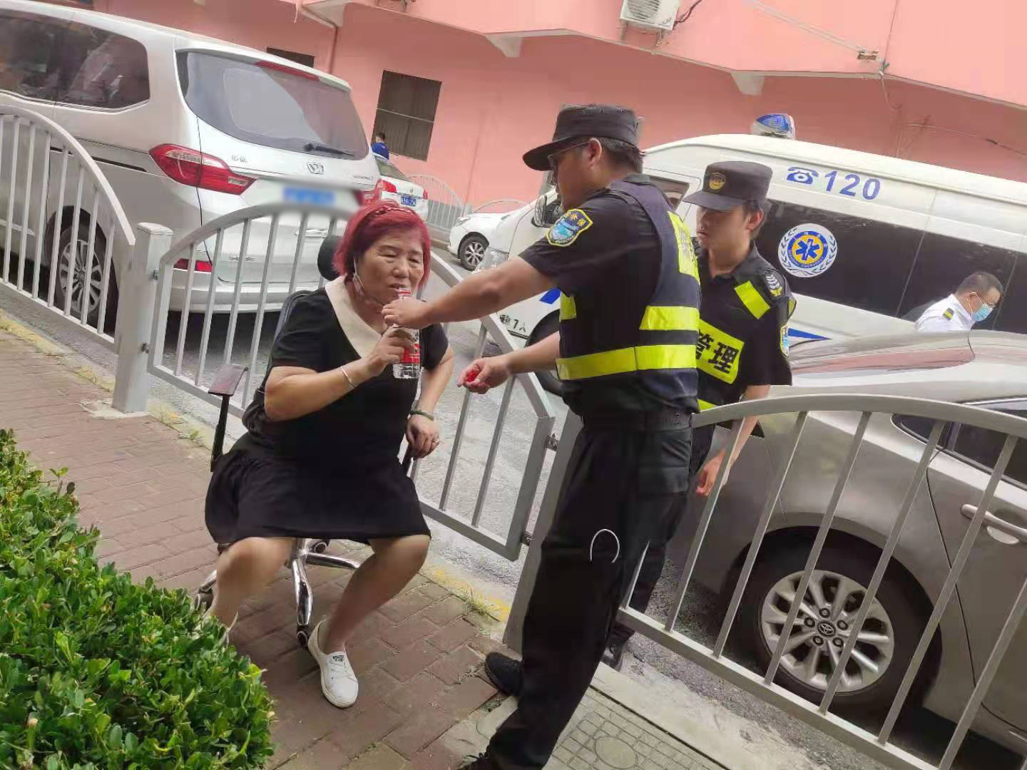 7月14日,宗保公司驻三林市容项目队员刘大旺热心帮助身体不适的阿姨。