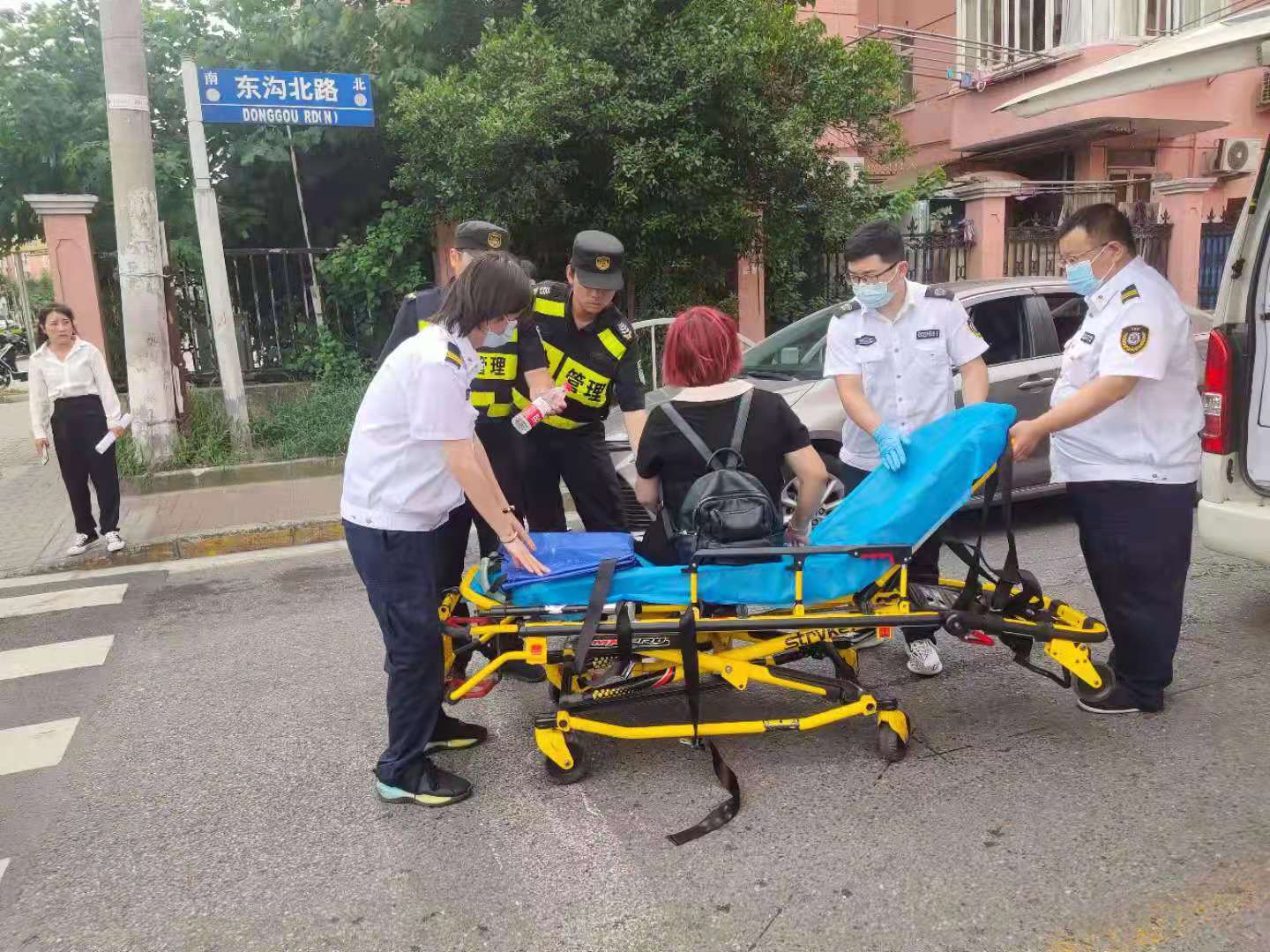 7月16日,顾俊、蒋云程、苏开志巡逻至东靖路东沟北路时,碰到一名中年女子寻求帮助。女子称自己头晕得厉害,恶心想吐,肚子也痛,可能是食物中毒了,请队员帮忙拨打120急救电话。