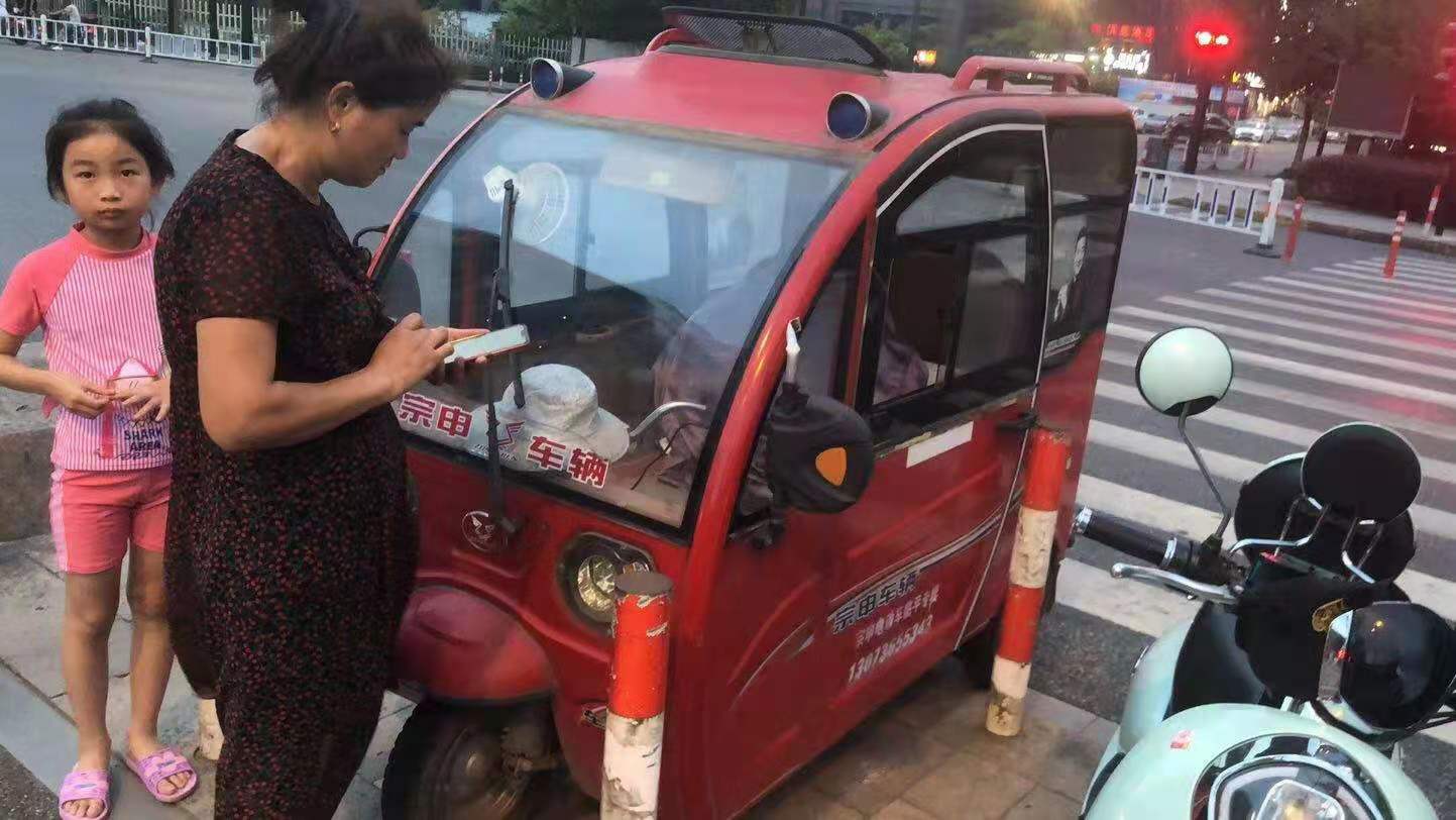 原来,三轮车车轮卡在了马路牙子上无法行走,电动车上还带着孩子,阿姨干着急,不知道该怎么办。刘明念一边安慰阿姨,一边帮助阿姨让小孩从车上下来。