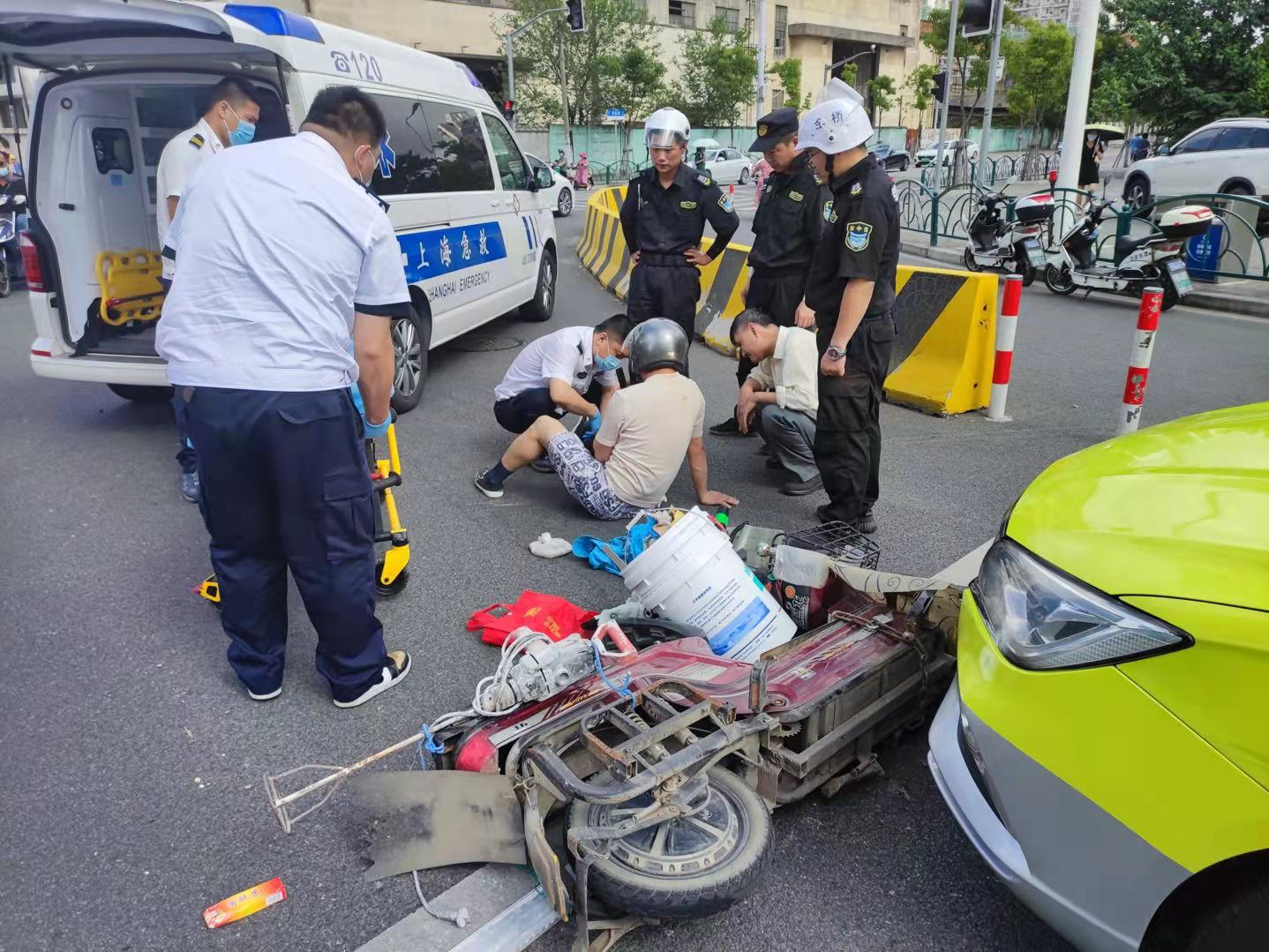 当日9:00,李小丁、李闯振、刘东东巡逻至东靖路莱阳路时,发现一辆出租车和一辆电瓶车在路口相撞,电瓶车驾驶员倒地不起,李小丁赶紧上前询问是否需要帮助,出租车司机说他已呼叫120和110。
