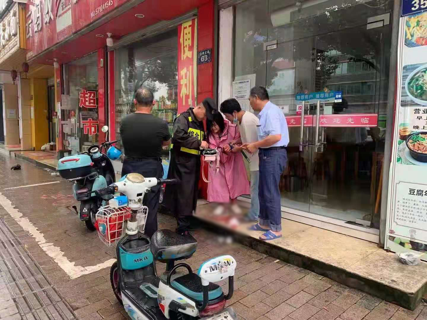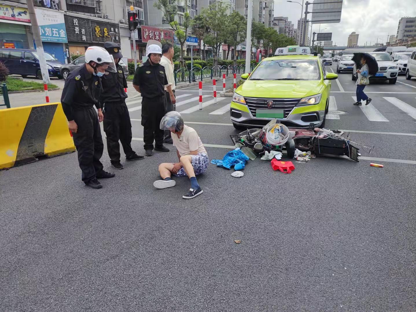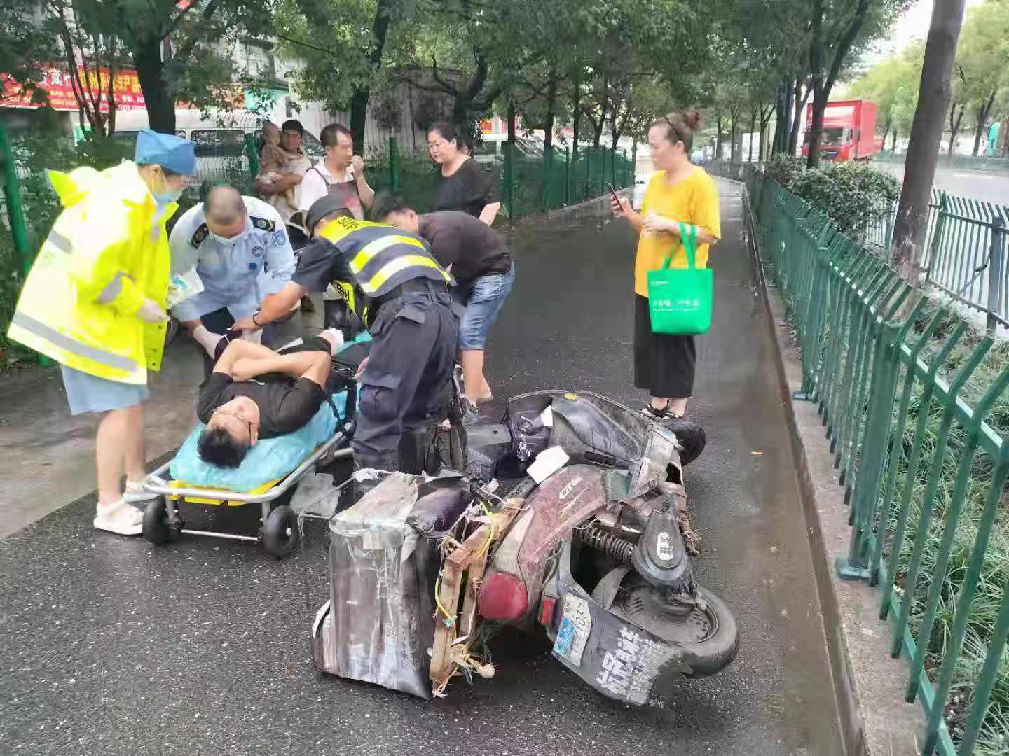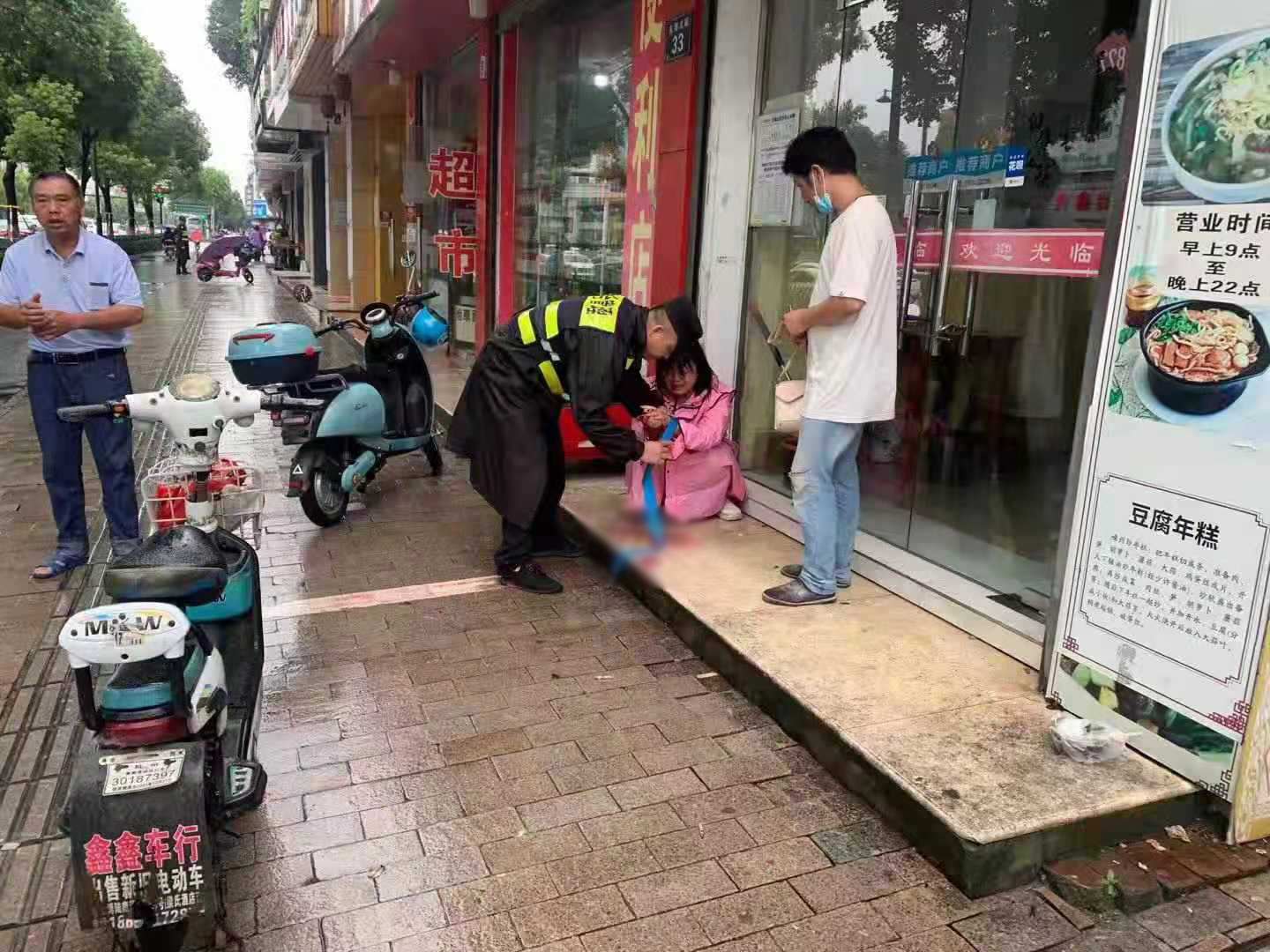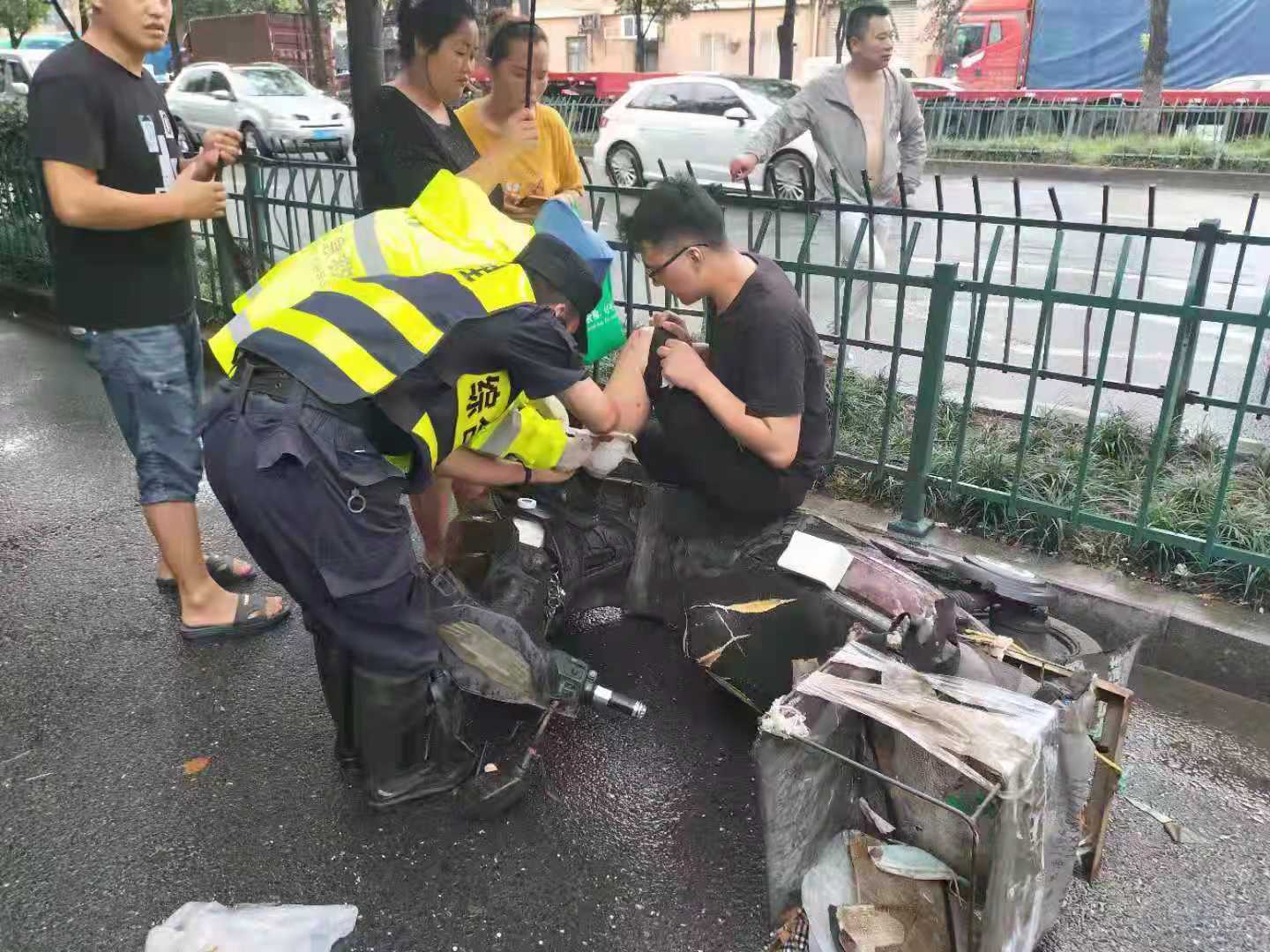 当日9:15,受台风影响,天气阴雨绵绵,路面积水湿滑。李建军、沈明锐巡逻至东湖北路与星光街路口时,看到一位骑电瓶车小姑娘摔倒在地,就立即上前查看。