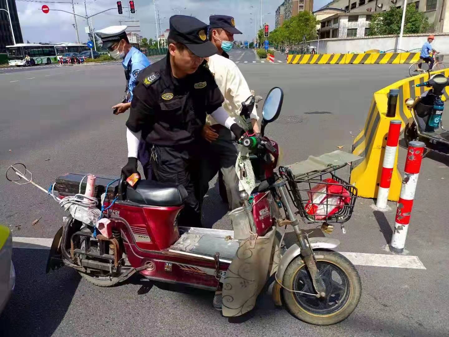 当天18:40,队员刘明念在东湖街道北沙西路156号金都夏宫附近巡逻时,看到一位阿姨骑着电动三轮车紧贴马路牙子,一直在加速,但电动三轮车就是不动。看到这一幕的刘明念,赶紧上前询问。