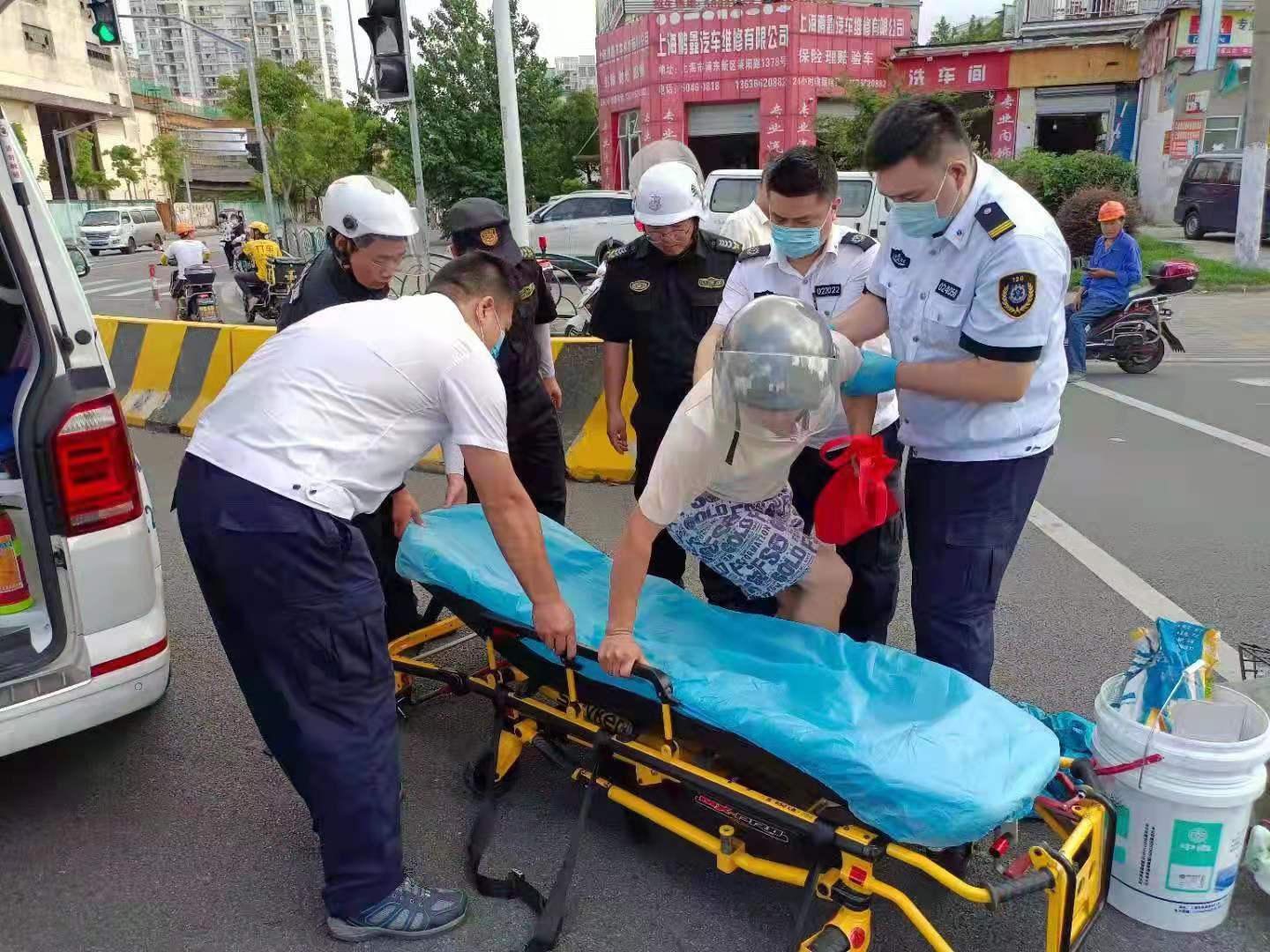 很快,交警和120救护车赶到现场,定好责任后,队员协助交警将电瓶车推到路边,帮助救护人员将受伤驾驶员送上救护车,然后回到岗位继续值勤。